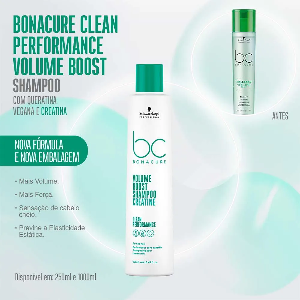 Bonacure Clean Performance: Tecnologia Avançada (queratina vegana e equalizador de células, que trata o cabelo de dentro pra fora), ingredientes de alta performance de skincare em sua fórmula limpa (sem sulfatos, corantes artificiais, silicones, parabenos, óleos minerais e microplásticos), além de ter a embalagem reciclável e feita de até 97% de plástico reciclado. Contém 6 sublinhas, uma para cada necessidade capilar: Repair Rescue (cabelos danificados), Color Freeze (cabelos coloridos), Moisture Kick (cabelos normais a secos, cacheados/ondulados), Volume Boost (cabelos finos), Q10 (cabelos maduros/enfraquecidos) e Clean Balance (todos os tipos de cabelos).