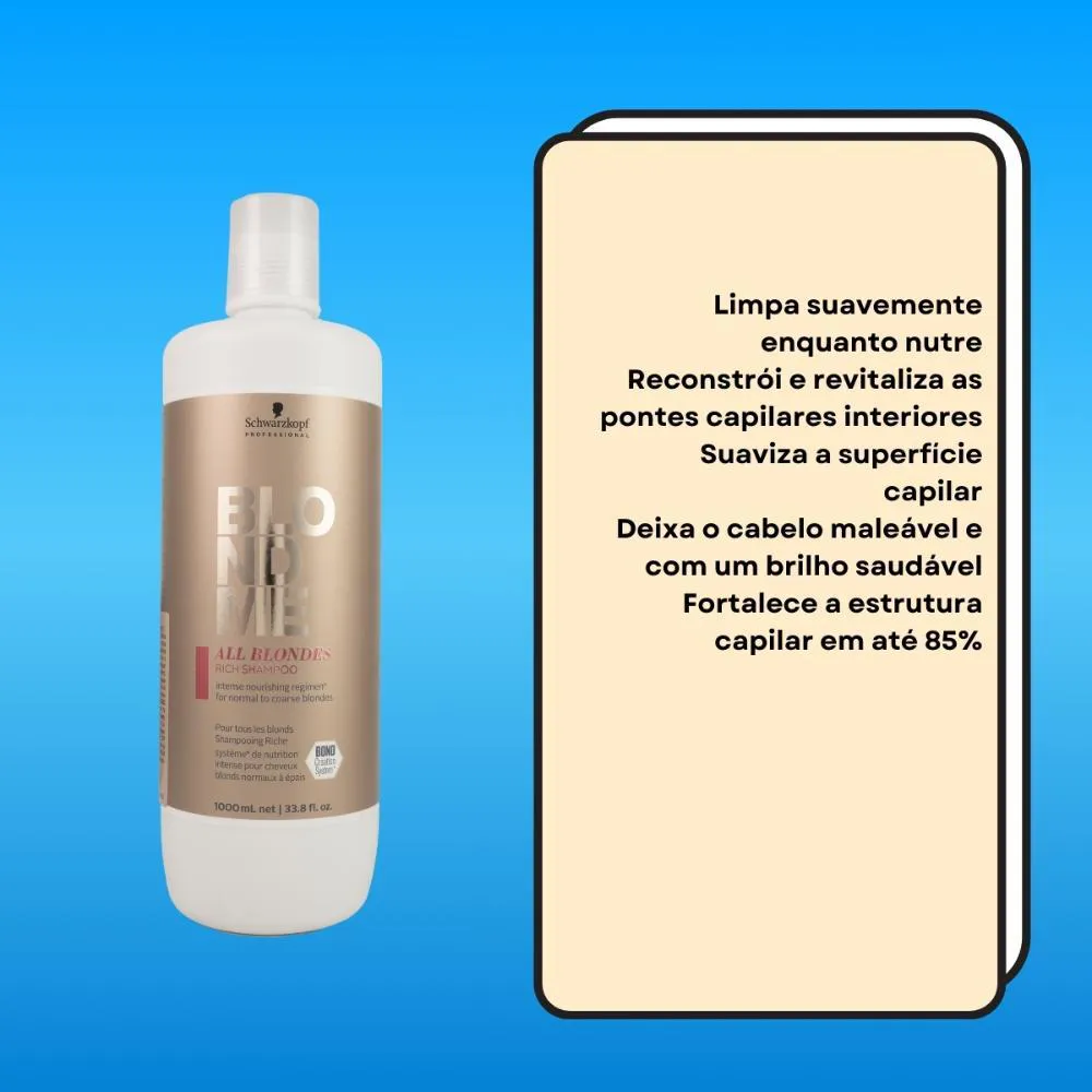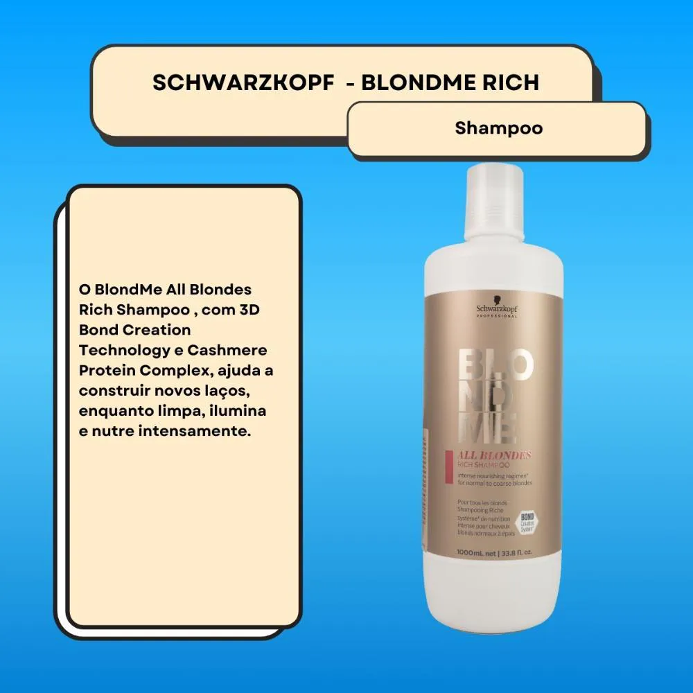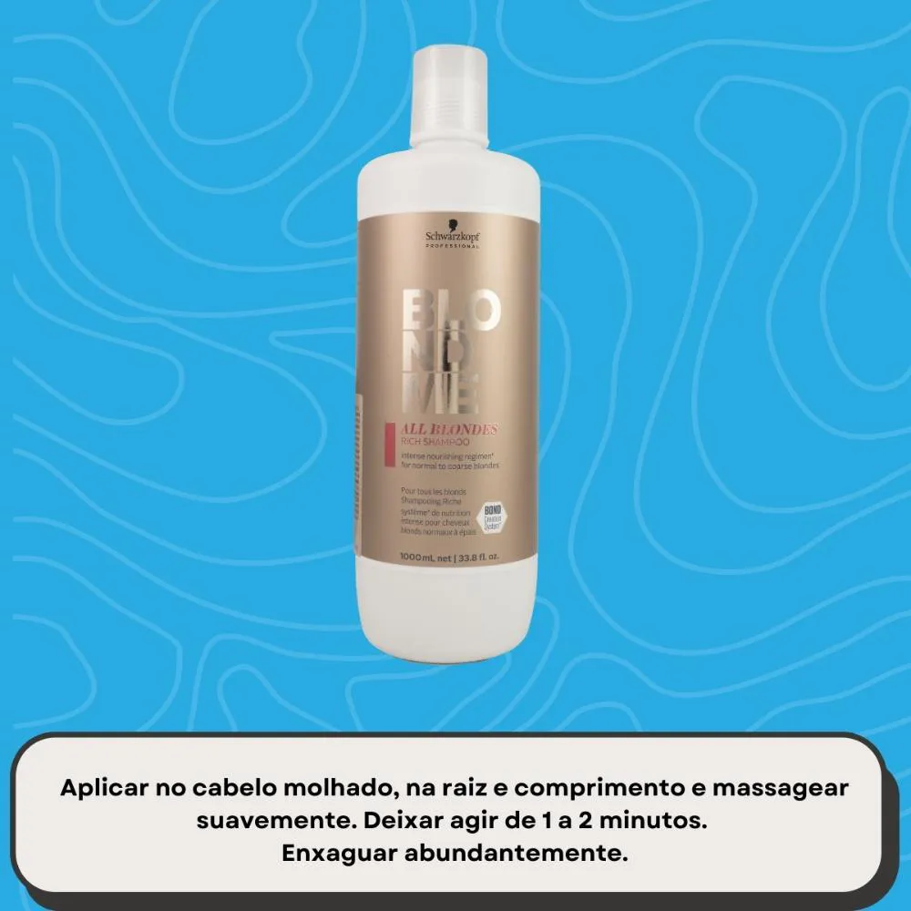 Varia conforme a categoria (shampoo, máscara, finalizador) e a necessidade do seu cabelo. CTA: Inclua o Shampoo Schwarzkopf BlondMe All Blondes Rich 1 Litro na sua rotina e mantenha a constância para evoluir o resultado a cada uso.