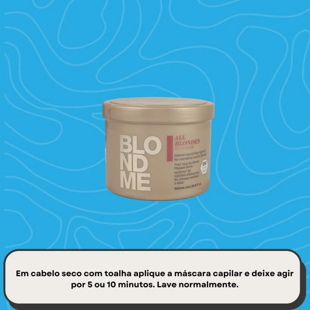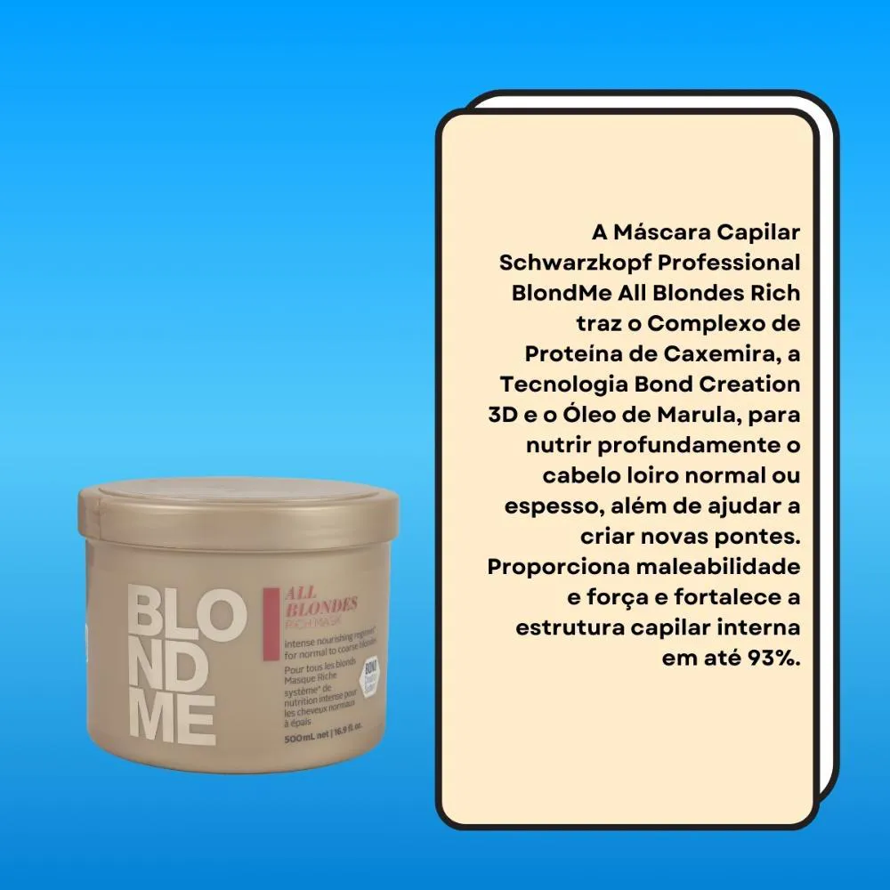 Varia conforme a categoria (shampoo, máscara, finalizador) e a necessidade do seu cabelo. CTA: Inclua o Máscara Schwarzkopf BlondMe 500 ml na sua rotina e mantenha a constância para evoluir o resultado a cada uso.
