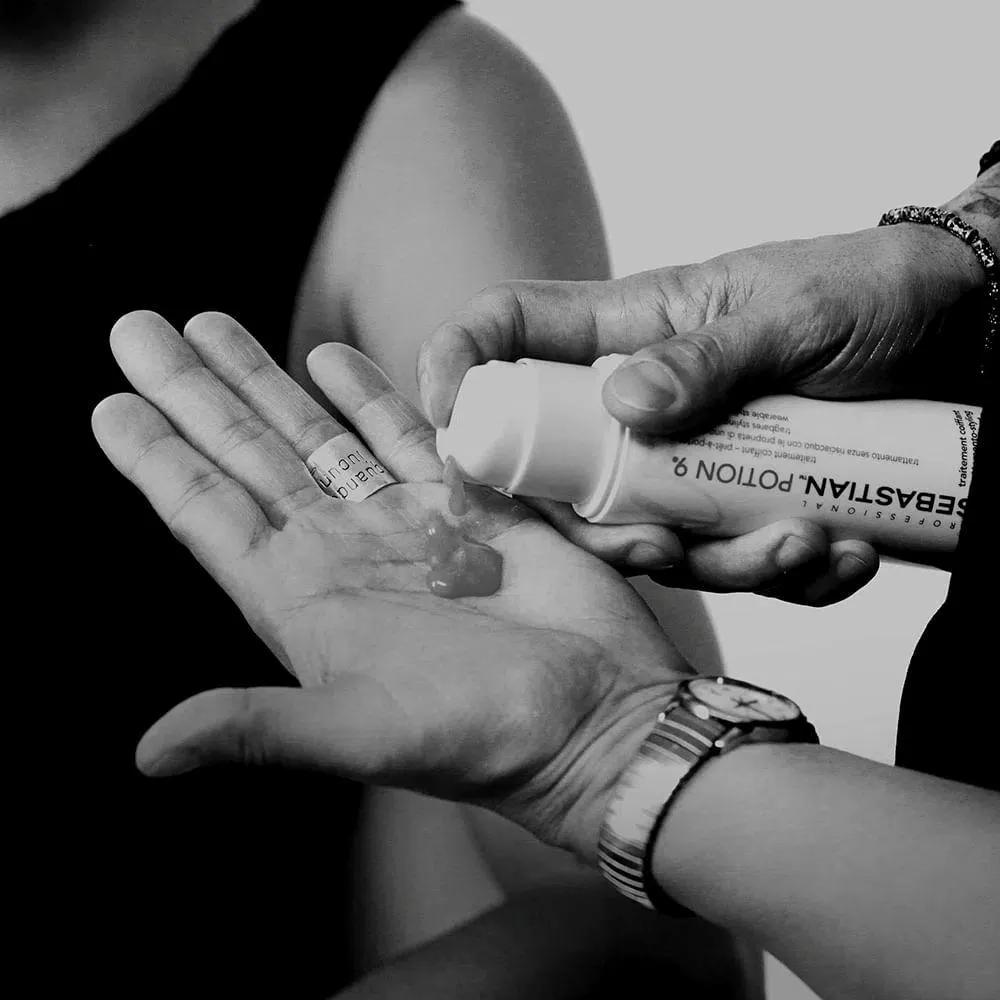 Aplique o Potion 9 da Sebastian nos cabelos úmidos ou secos.