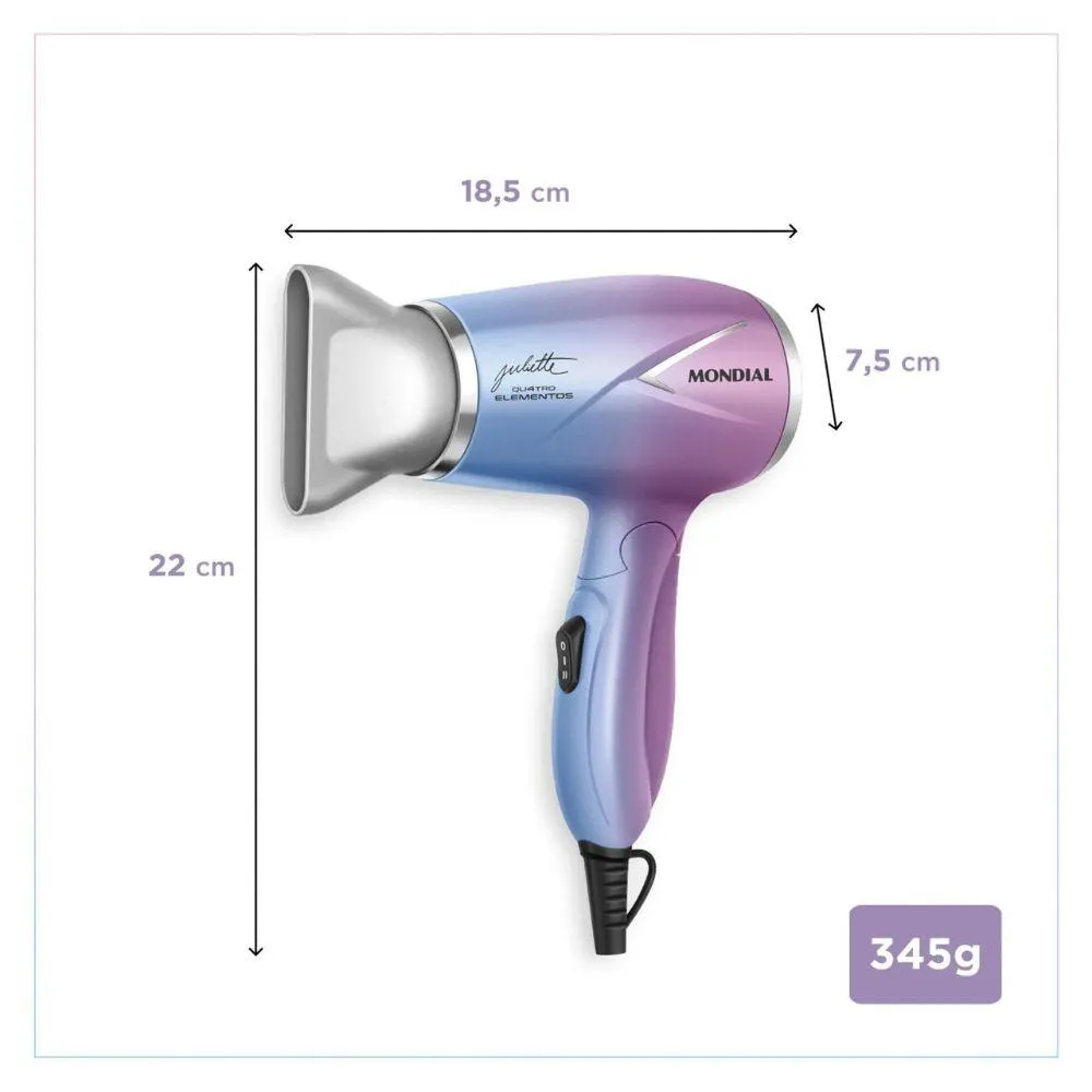Secador de cabelo Mondial By Juliette 1200W Cabo Dobravel SCT-JU-03 Azul-Rosa Bivolt O Secador de Cabelo Travel da Linha by Juliette Qu4tro Elementos traz um revestimento especial enriquecido com infusao de Ceramica, Titanio, Tourmaline e Nano Silver. Esses 4 elementos, juntos, protegem seus fios e garantem uma aparencia mais saudavel aos cabelos. Compacto, dobravel e projetado para caber perfeitamente na sua bolsa ou mala, o secador bivolt e perfeito para viagens, academia e a solucao ideal para manter seu cabelo impecavel onde quer que voce va. Saiba mais sobre o SCT-JU-03: Revestimento especial com QU4TRO elementos -Ceramica: Garante uma melhor distribuicao do calor e contribui para uma secagem rapida e mais saudavel. -Titanio: Tecnologia que age na umidade dos cabelos e reduz o tempo de secagem, alem de eliminar o efeito frizz. -Tourmaline: Fonte natural de ions negativos, que eliminam o frizz e garantem mais brilho. -Nano Silver: Particulas de prata que ajudam a inibir a acao de bacterias, contribuindo para a protecao dos fios e do couro cabeludo. Informacoes Tecnicas: -Modelo: SCT-JU-03 -Cor: Azul Rosa -Voltagem (Tensao): Bivolt Chaveado -Peso: 0,345g -Garantia: 12 meses -Controle de temperatura: 2 temperatura e velocidade -Potencia: 1200W -Comprimento do Cabo: 1,8m -Grade traseira removivel: Sim -Jato de Ar Frio: Nao - Seca, Alisa, Modela -Itens inclusos: 01 Secador de Cabelos; 01 Bocal Direcionador e 01 Manual de Instrucoes.