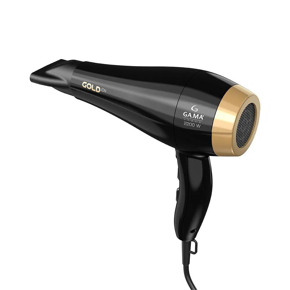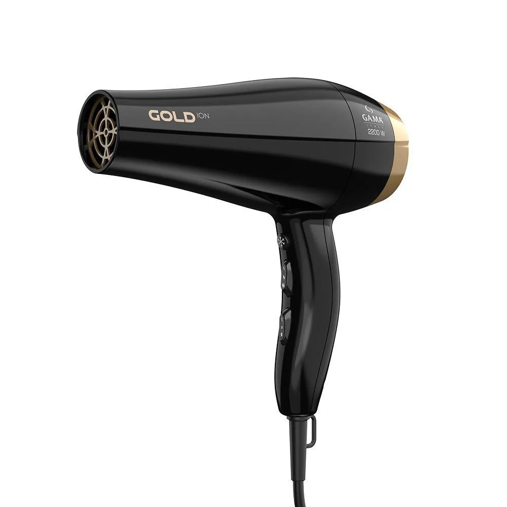 Muito mais brilho e reconstrucao para o seu cabelo! A grade frontal do secador Gold Ion e feita com a exclusiva tecnologia Essential Oil, ativada com o calor do produto, que nesta versao traz o oleo de Argan, muito conhecido como o ouro liquido entre os profissionais cabeleireiros: e rico em acidos graxos, omega 9 e vitamina e, sendo assim um antioxidante poderoso, que promove hidratacao e nutricao profunda para os fios, combate o envelhecimento e protege dos efeitos negativos do calor. Ja a tecnologia Antifrizz que tambem esta presente no secador Gold Ion, e produzida pela alta emissao de ions negativos, responsavel por manter a umidade natural dos fios ao mesmo tempo em que fecha a cuticula capilar; resultando em cabelos mais saudaveis, sedosos e com menos frizz. secadores danificam o cabelo? Nao com a linha Oleos Essenciais da GA.MA Italy! A grade frontal do secador e feita com oleo essencial de Argan, e ao aquecer libera suas propriedades trazendo muito mais brilho e reconstrucao para seus cabelos! Especificacoes Tecnicas: - Marca: GA.MA Italy - Referencia: BECHD0000002808 - Modelo: Gold Ion - Linha: Professional - Cor: Preto e Dourado - Voltagem: 127V ou 220V (nao e bivolt) - Potencia: 2200W - Tipo de Tomada: 16A - Plug Hexagonal - Pino Redondo de 4,8mm - Comprimento do Cabo: 2 metros - Consumo Aproximado de Energia: 2 Kw h - Velocidades: 2 Velocidades - Niveis de Temperatura: 3 Temperaturas - Jato de ar Frio: Sim - Tipo de Motor: AC Profissional - Tecnologia: Ions ceramica, Essential Oil - Acessorios: com Bico direcionador de ar - Material: Plastico, metal - Garantia: 06 meses