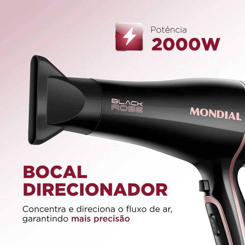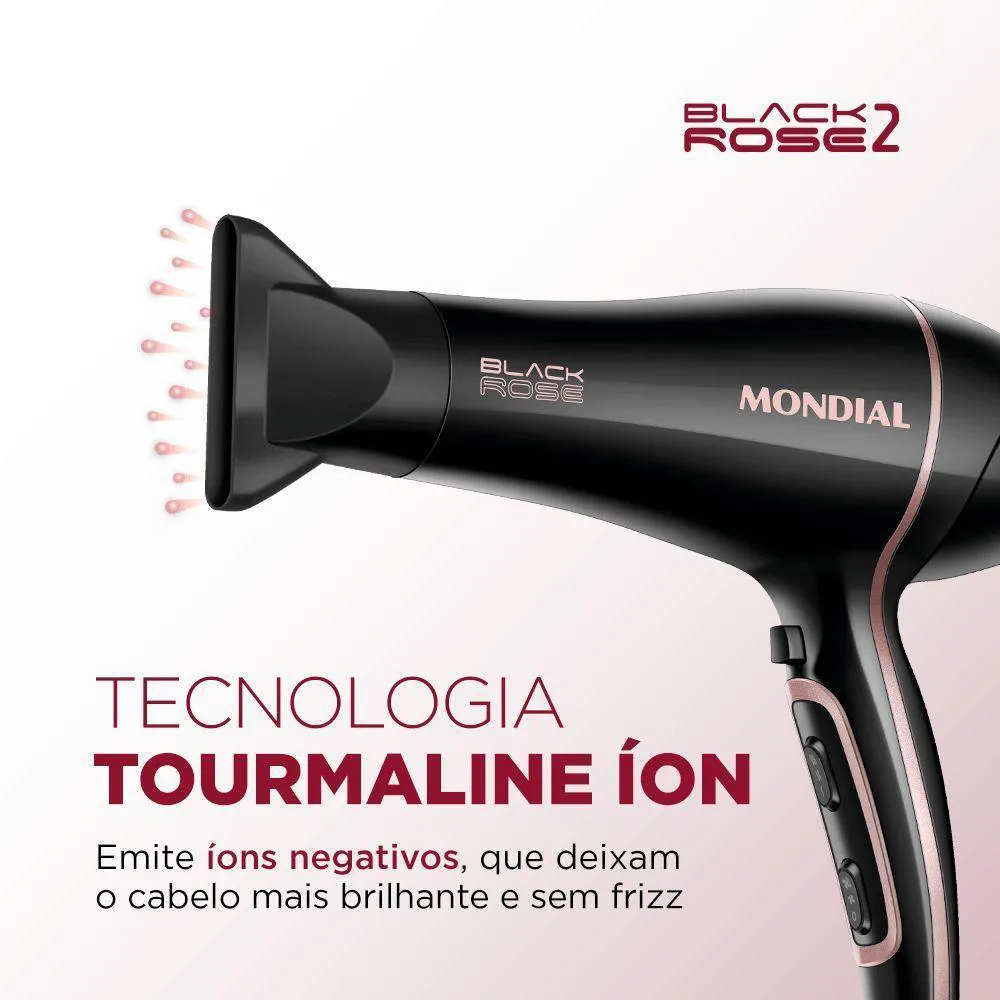 Praticidade e superpotência no seu dia a dia! Os 2.000W do Black Rose SCN-02 garantem um excelente desempenho para secagem ágil e eficiente dos fios. Além disso, a tecnologia Tourmaline Íon proporciona um aspecto mais saudável aos fios, reduzindo o frizz! Saiba mais sobre o Secador de cabelo Mondial: