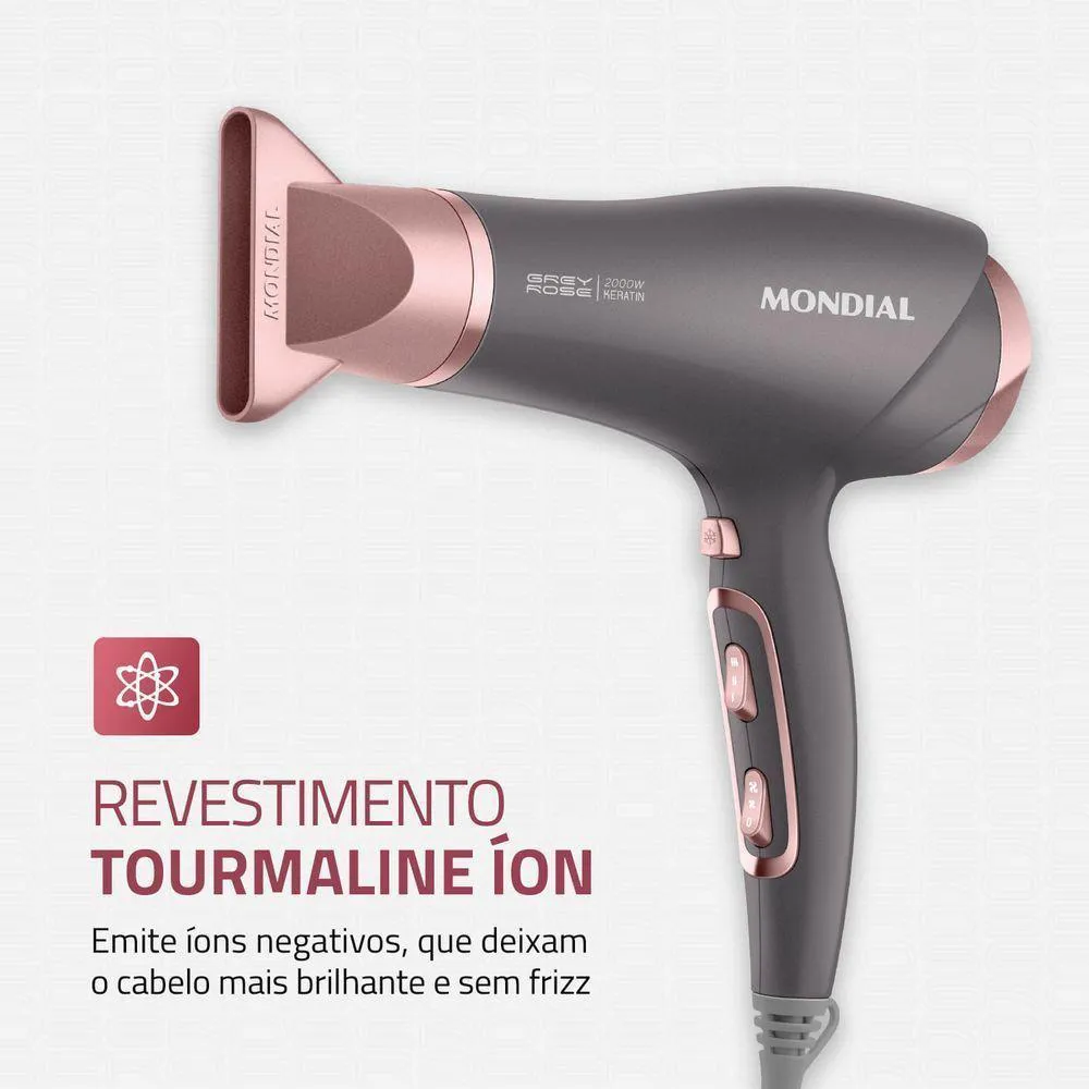 O Secador De Cabelos Mondial Grafine/rose SCN-11 é um aparelho de secagem capilar com design moderno e tecnologia avançada, desenvolvido para cuidar e tratar os cabelos durante o processo de secagem. Possui revestimento cerâmico com queratina e tourmaline íon, que protege os fios.