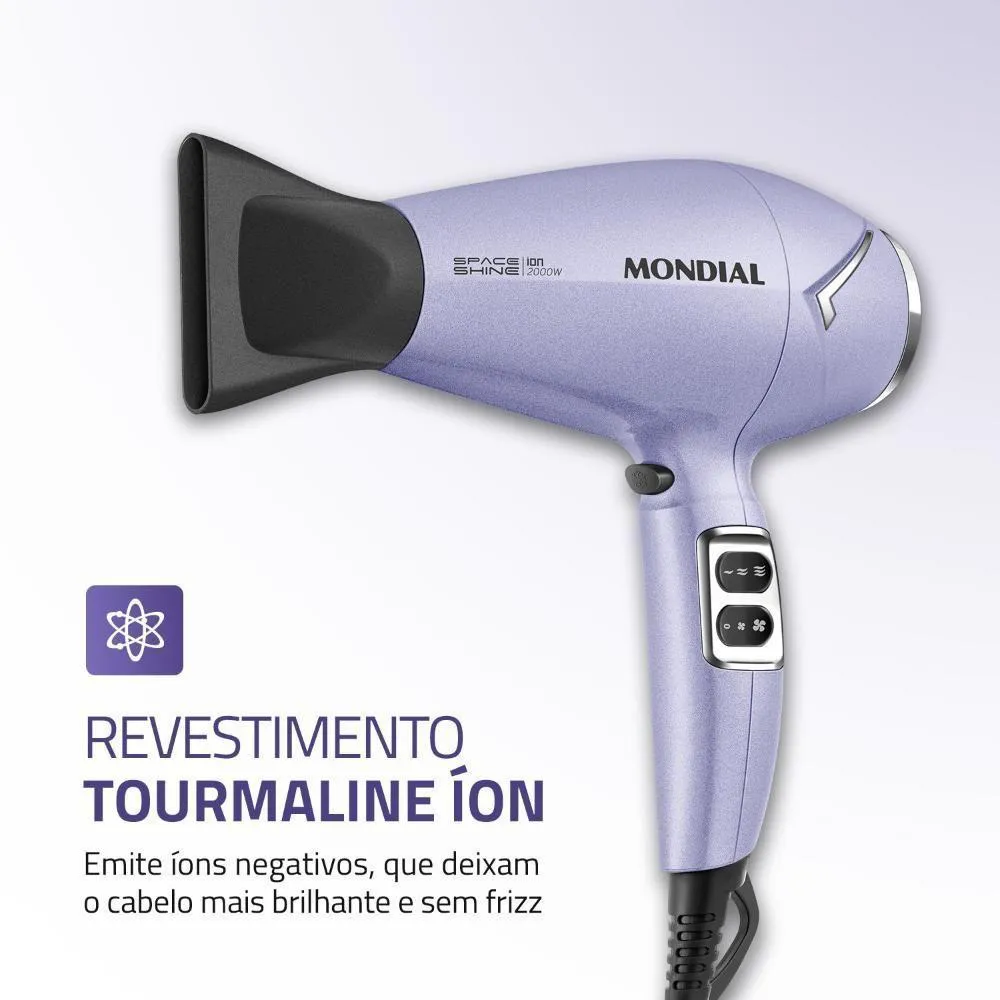 O secador de cabelo Space Shine SC-21 da Mondial tem um design moderno e uma tecnologia que garante hiper brilho aos fios. O Tourmaline Íon protege seu cabelo durante a secagem, reduz o frizz e proporciona um brilho radiante. Além disso, os 2.000W de potência oferecem uma secagem ágil e eficiente.Diferenciais do Produto:Tecnologia Tourmaline Íon: Com o calor, a turmalina libera íons que selam as cutículas dos fios, eliminando o frizz, garantindo um brilho intenso e um resultado de cabelo macio e radiante.Alta Potência de 2000W: Oferece um desempenho excepcional, garantindo uma secagem muito mais rápida e eficiente para todos os tipos de cabelo.6 Combinações de Temperatura e Velocidade: Alterne entre 3 níveis de temperatura e 2 velocidades para obter a secagem e a modelagem perfeitas para o seu tipo de cabelo.Jato de Ar Frio: Essencial para finalizar o penteado, o choque de temperatura ajuda a fixar a modelagem e a reduzir o frizz, proporcionando um acabamento impecável.Praticidade no Uso: Acompanha um bocal direcionador para mais precisão ao modelar, e a grade traseira é removível, o que facilita a limpeza e aumenta a vida útil do aparelho.