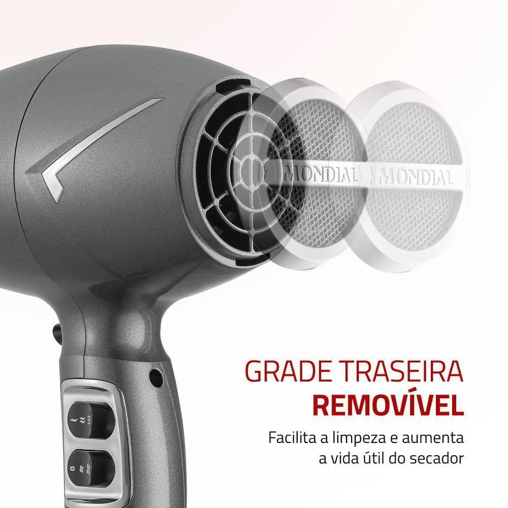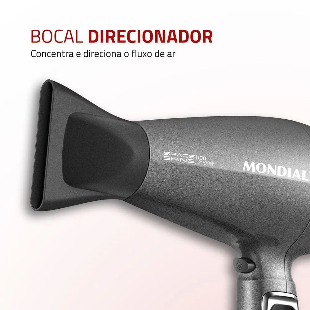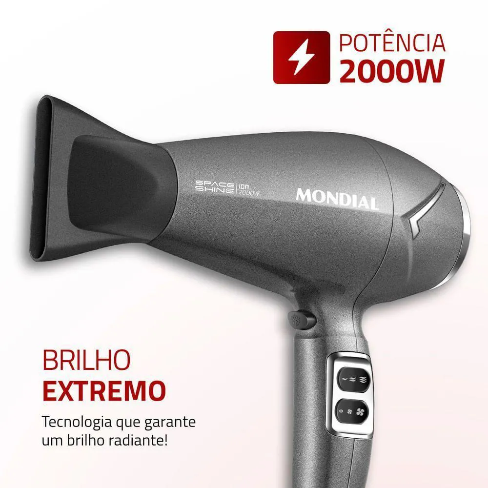 O secador de cabelo space shine sc-20 da mondial tem um design moderno e uma tecnologia que garante hiper brilho aos fios. incrível né? o tourmaline íon protege seus fios durante a secagem, reduz o frizz e proporciona um brilho radiante ao cabelo. além disso, os 2.000w de potência oferecem uma secagem ágil e eficiente. saiba mais sobre o sc-20 da mondial:brilho extremocom o calor, a tecnologia tourmaline libera íons que selam as cutículas dos fios proporcionando brilho intenso e reduzindo o frizz. o resultado é um cabelo com brilho radiante e muito macio.potência de 2.000wa alta potência deste secador oferece um desempenho excepcional, garantindo uma secagem rápida e eficiente.3 temperaturas + 2 velocidades melhor desempenho para secar, alisar e modelar. alterne entre as variações de velocidade e temperatura para uma secagem mais adequada aos diferentes tipos de cabelo.jato de ar frioo choque de temperatura no final da secagem reduz o frizz e ajuda a fixar a modelagem.bocal direcionadorconcentra e direciona o fluxo de ar, proporcionando mais precisão e facilidade para modelar e disciplinar os fios.grade removívelfacilita a limpeza garantindo mais vida útil ao aparelho.um ano de garantia mondiala mondial é a escolha de milhões de consumidores. mondial, a escolha inteligente!