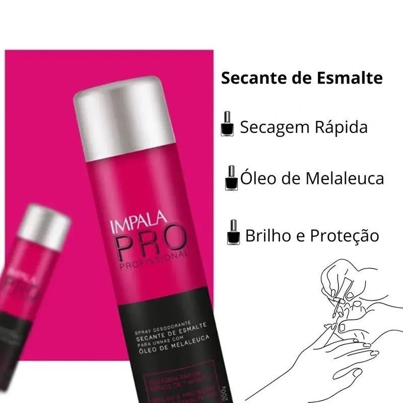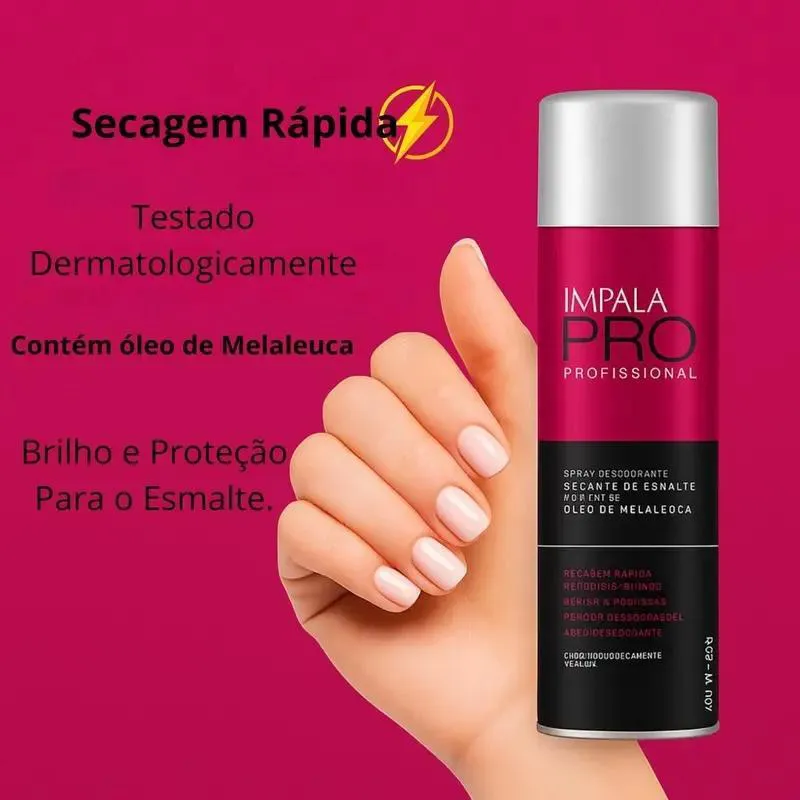 SECANTE DE ESMALTE IMPALA 400ML OLEO MELALEUCA O Spray Secante Esmalte para Unhas Impala proporciona uma secagem rápida do esmalte, evitando possíveis arranhões e borrões. Forma uma fina camada de brilho nas unhas, proporcionando unhas mais bonitas e com brilho.