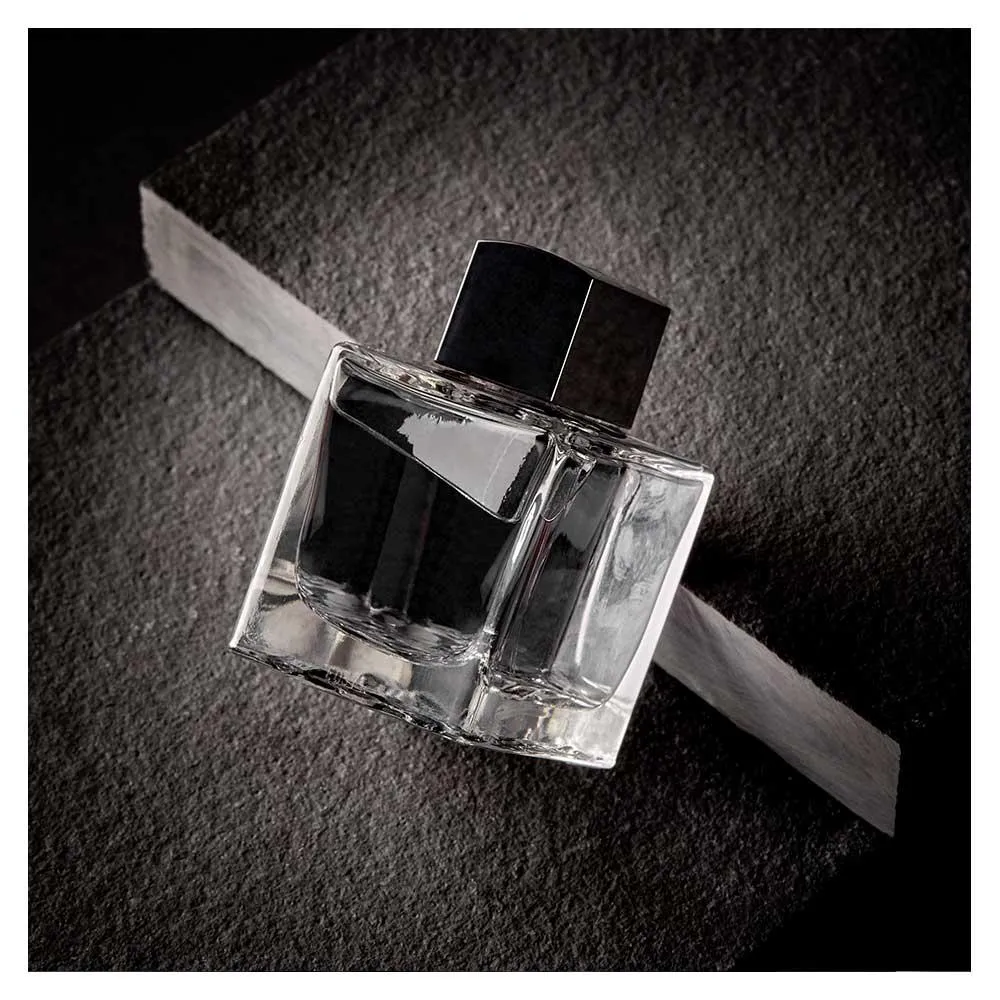 O frasco é totalmente masculino, com vidro preto esfumaçado e formato de cubo. A base esculpida acrescenta originalidade e dá personalidade ao perfume.