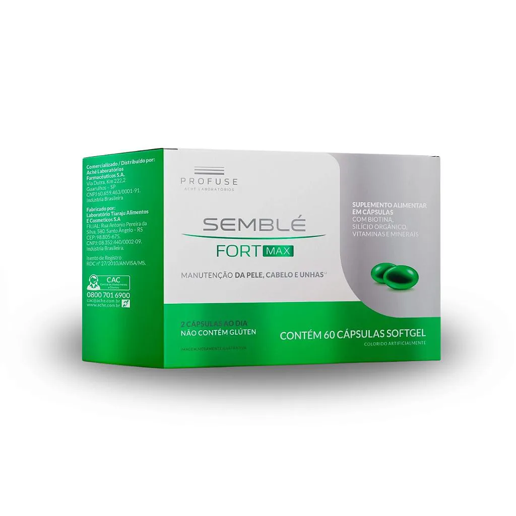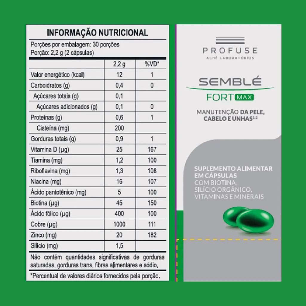 O Semblé Fort Max Profuse é um suplemento alimentar em cápsulas, desenvolvido com uma fórmula inovadora contendo Silício Orgânico Ortosil®, Biotina, Zinco, vitamina D, Ácido Fólico, Cobre e outros nutrientes essenciais. Sua composição visa fornecer suporte nutricional para o organismo.