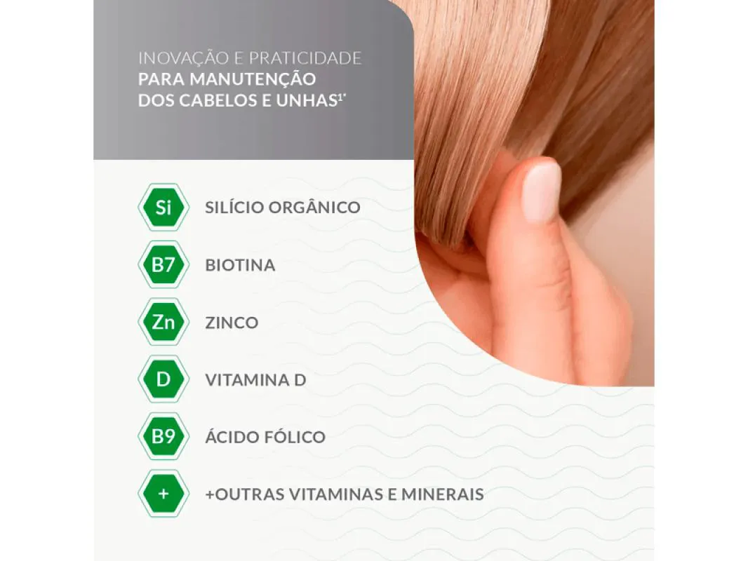 - Fortalece cabelos e unhas com ação preventiva contra queda capilar.