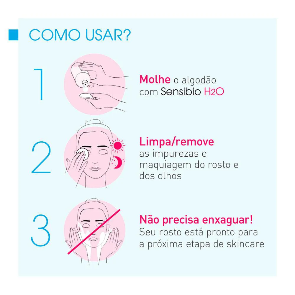 Sensibio H2O Solução Micellare Demaquilante da Bioderma, um perfeito demaquilante sem enxágue inspirada pela pele, limpa, acalma, refresca e remove a maquiagem do rosto e olhos de toda a pele, mesmo sensíveis e intolerantes.