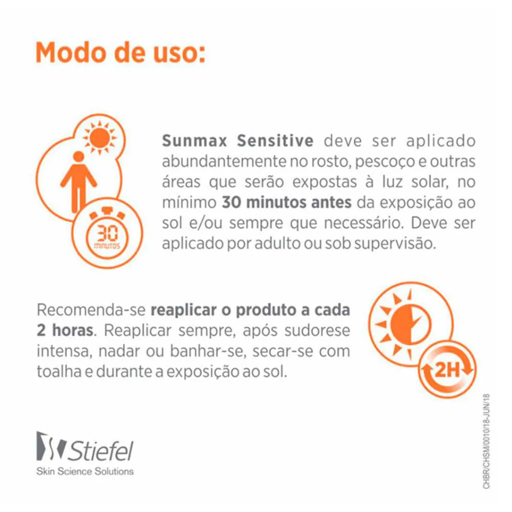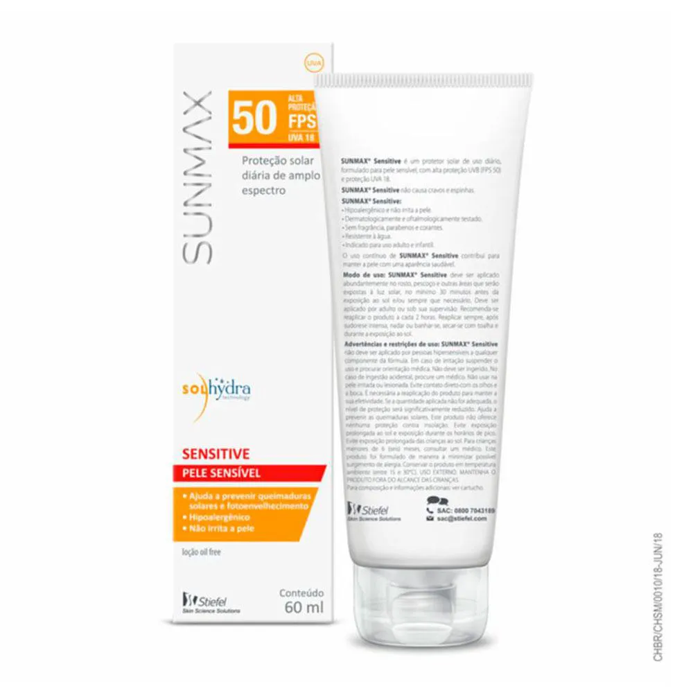 Sensitive FPS50 de Sunmax possui textura leve e finalização matte. É hipolergênico, sem álcool, parabenos ou corante. Não irrita a pele, é livre de álcool, parabeno, corante e fragrância, e é ideal para a pele oleosa e sensível por tratamento. Pode ser usado por crianças a partir de 6 meses. Dermatologicamente testado.