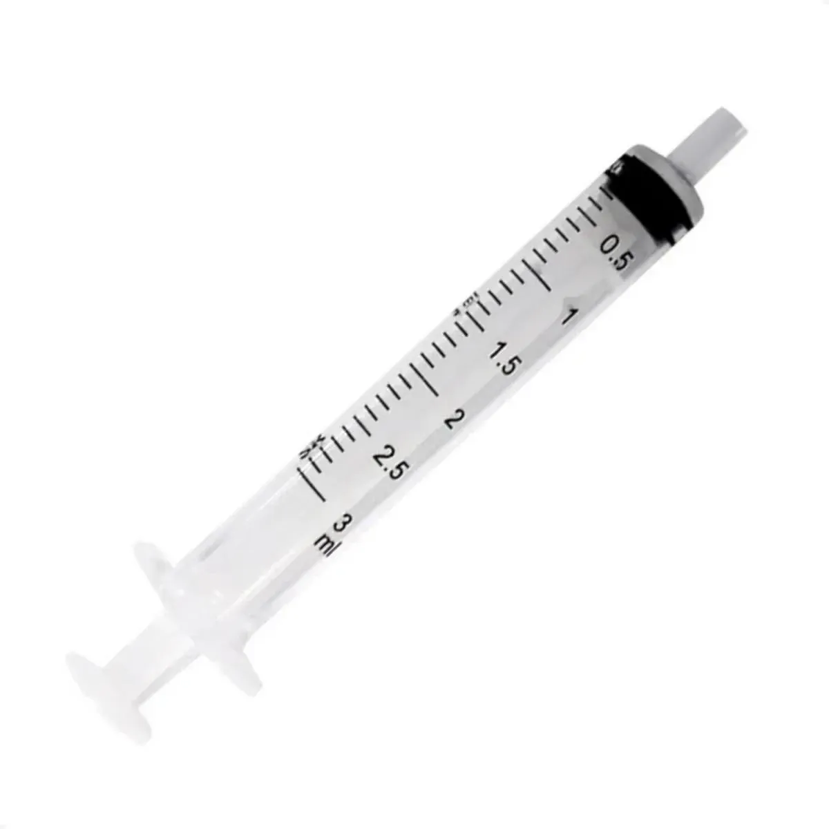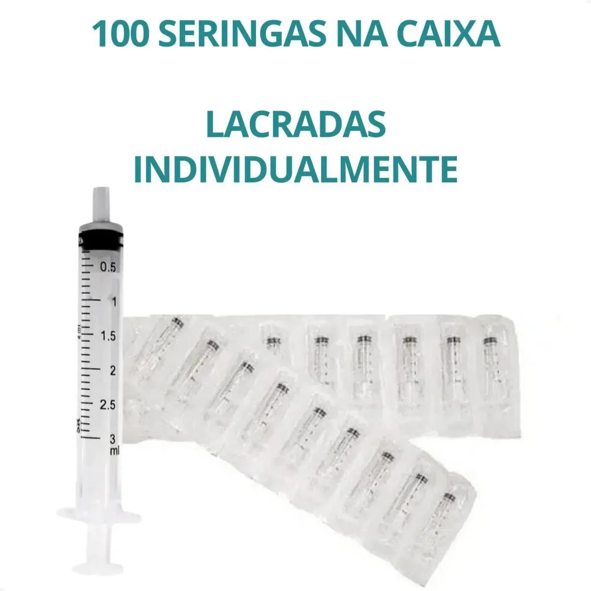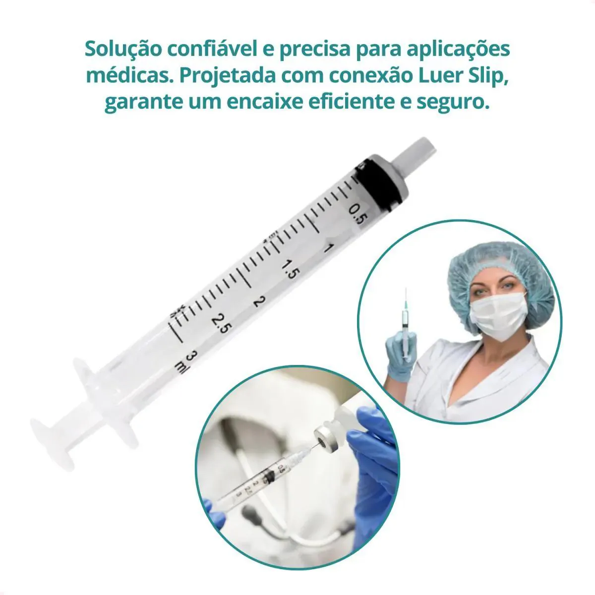 100 Seringas descartável de 3mL, com bico Luer Slip (encaixe simples) e sem agulha. Fabricada em polipropileno transparente, com graduação precisa e êmbolo com anel de retenção. Produto estéril (ETO), atóxico, apirogênico, de uso único e livre de látex.