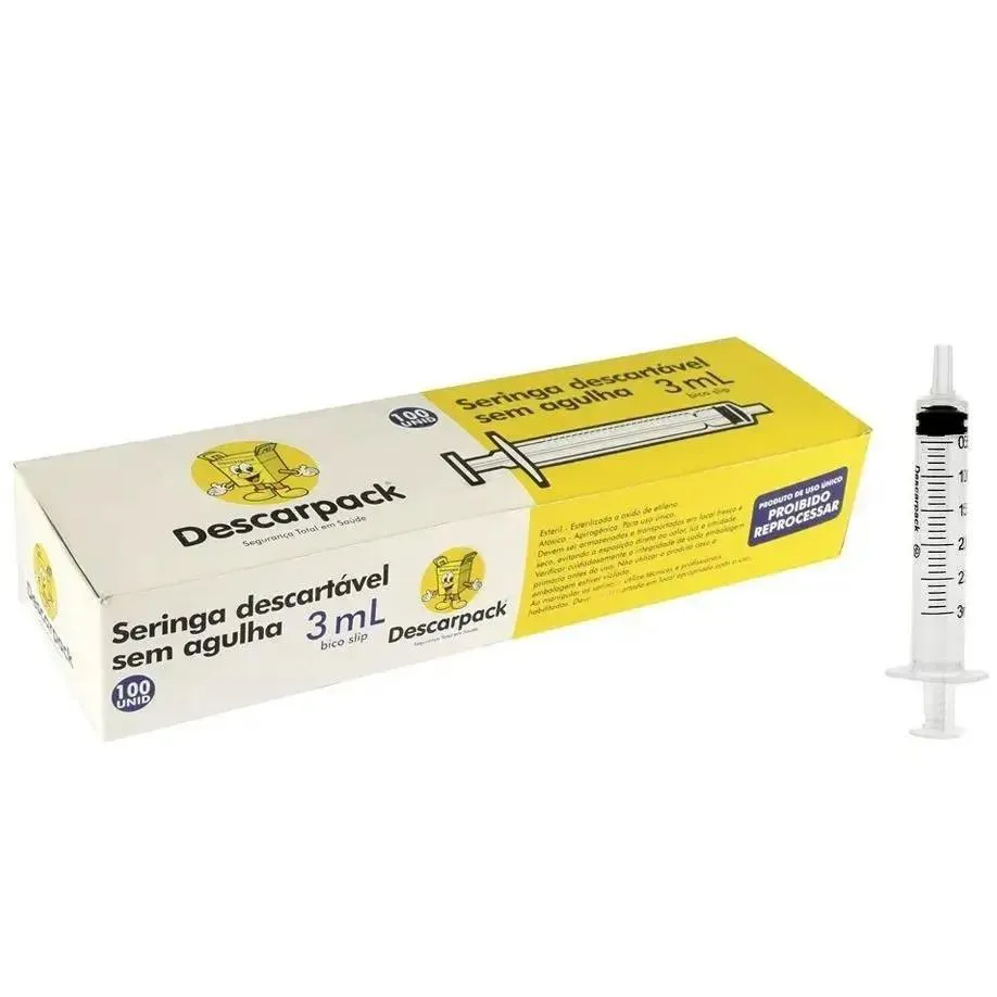Seringa Sem Agulha Luer slip liso 03 ml KIT 400 Un Descarpack 3ml Indicações: Para aplicação de medicamentos pelas vias hipodérmica, subcutânea, intramuscular e endovenosa em hospitais, clínicas, laboratórios, farmácias e clínicas veterinárias. Características: