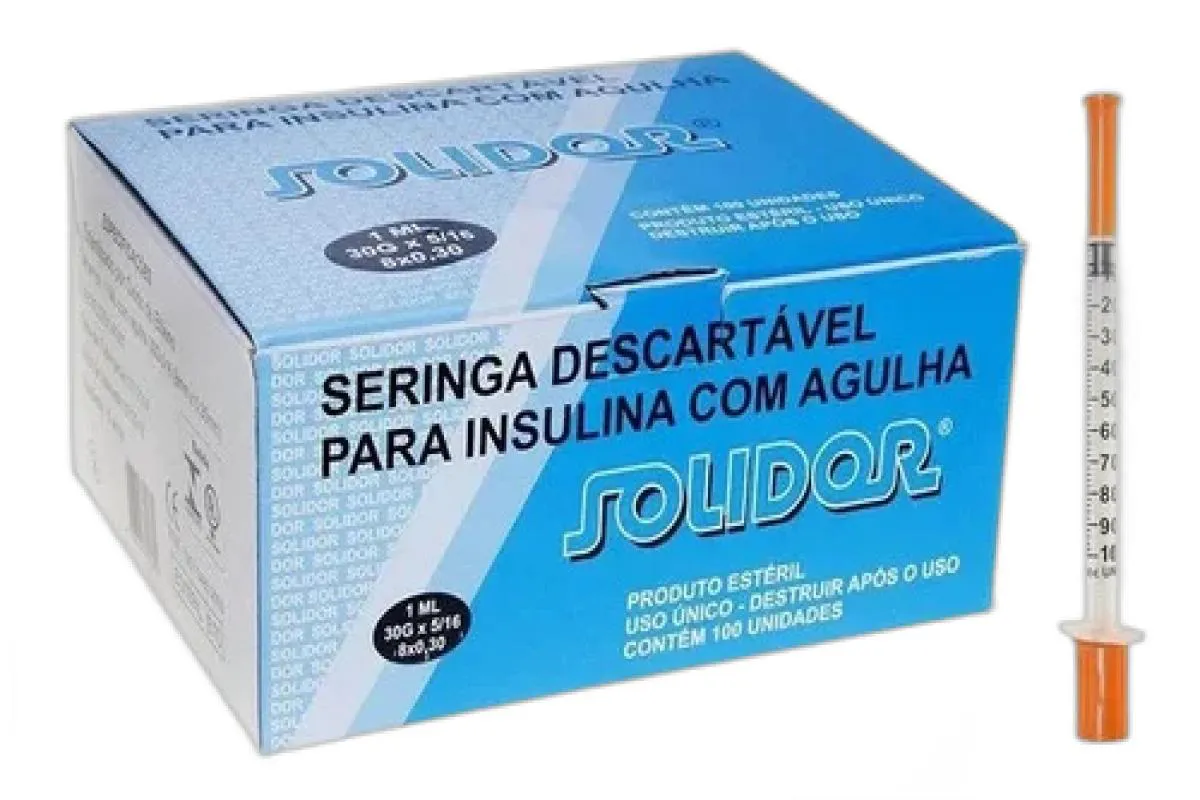 A Seringa de Insulina Descartável Solidor de 1ml com Agulha 13x0,33 é um dispositivo médico estéril e seguro, projetado para administração precisa de insulina e outras substâncias por via subcutânea. Com agulha acoplada de 29G e volume nominal de 1ml (100ui), é ideal para uso em pacientes diabéticos e para aplicação de vacinas.Benefícios:
