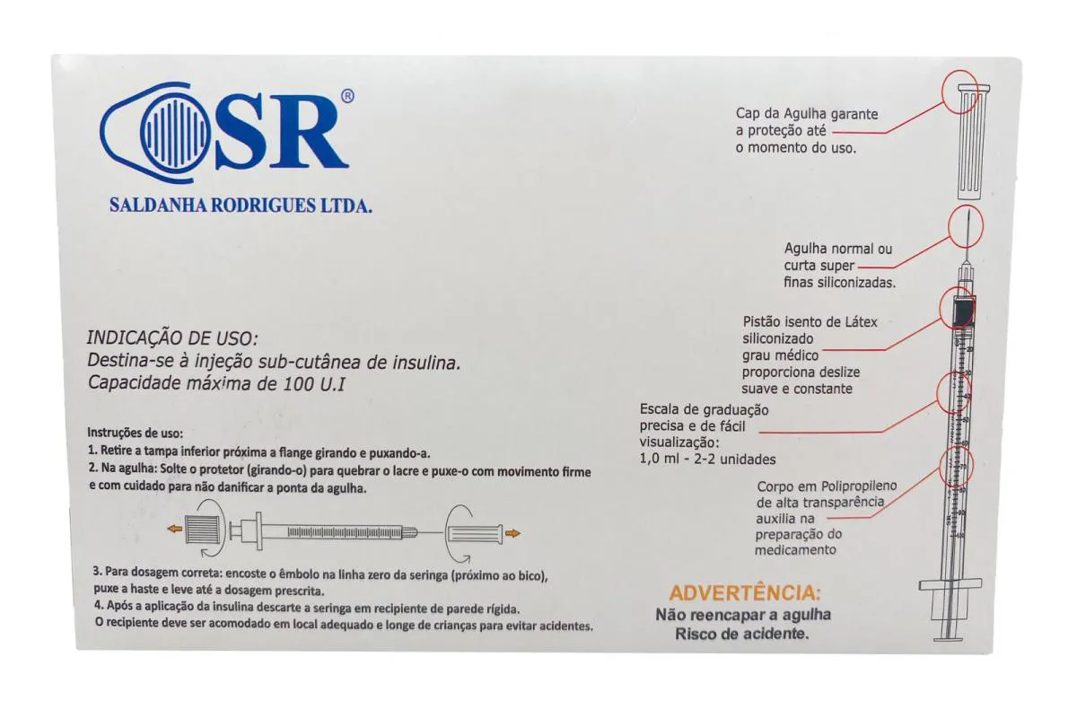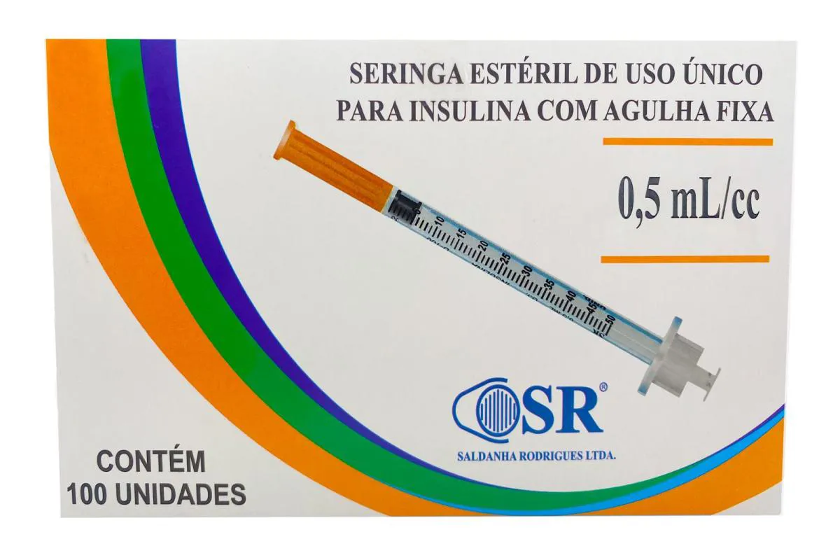 DESCRIÇÃO DO PRODUTO SERINGA 0,5ML 6X0,25MM COM AGULHA FIXA SR Seringa de uso único para insulina com capacidade de 50 UI e linhas de graduação subdivididas em 0,01 ml (1 UI). Fabricada em material transparente, atóxico, com graduação nítida e permanente. Possui agulha fixa, tri facetada, siliconada, sem espaço residual e embalagem individual. Características: