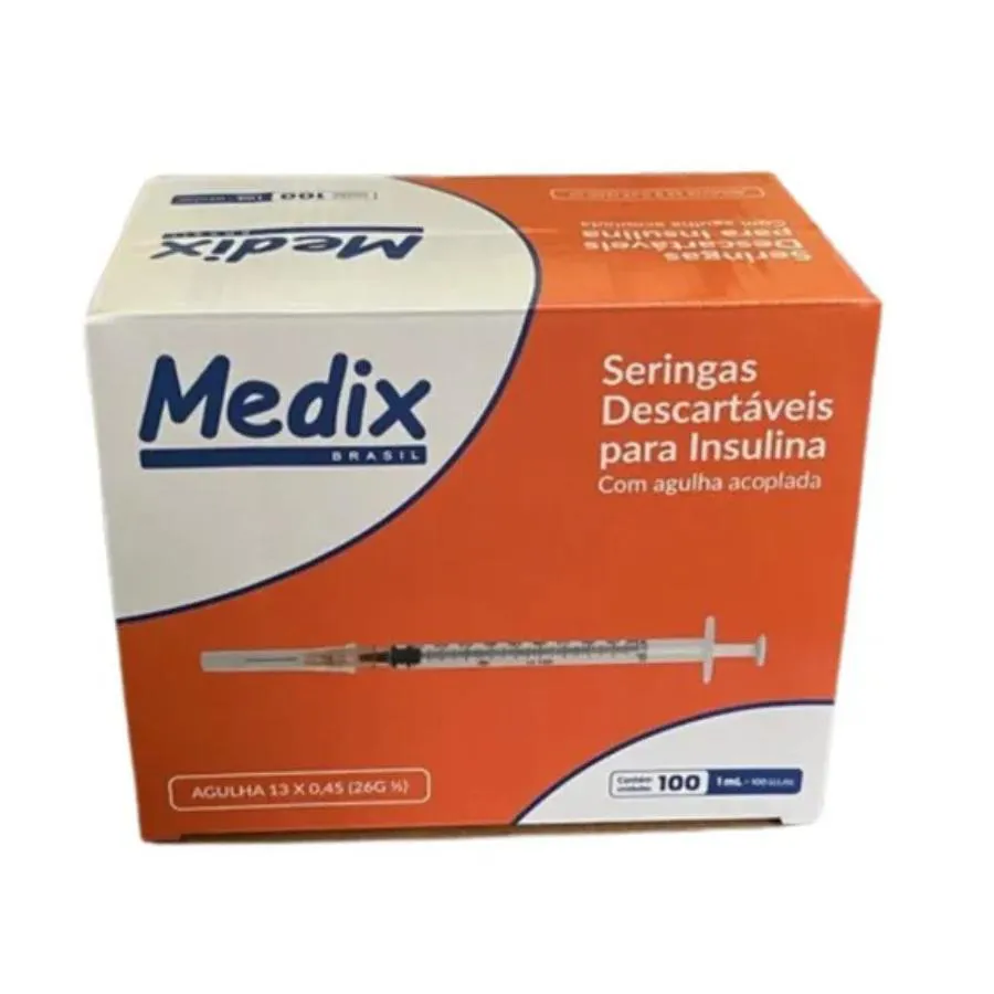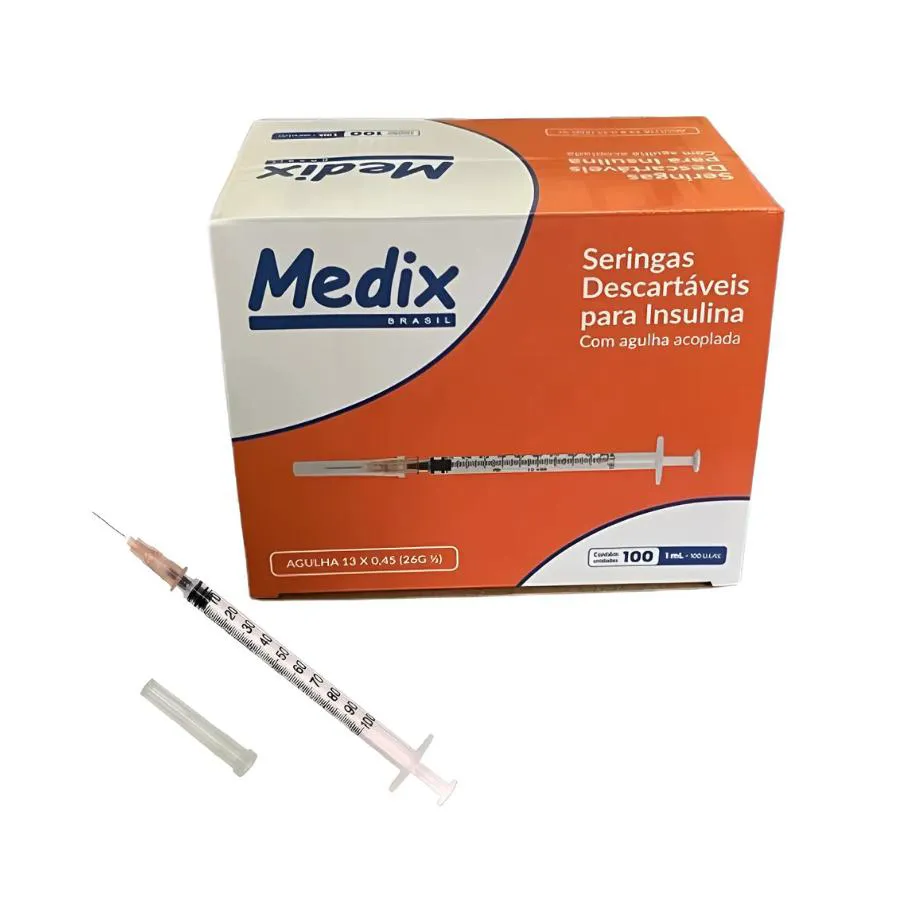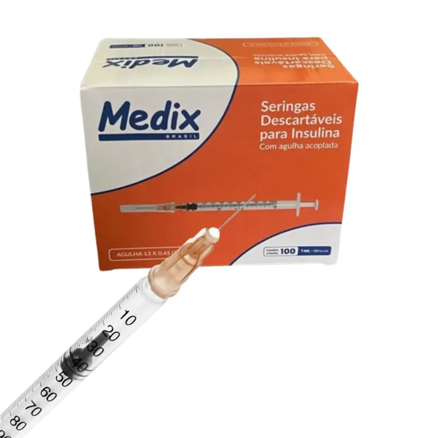 Seringa Insulina 1Ml Resíduo Zero 100 Ui Agulha Acoplada 13Mmx0,45Mm (26G 1/2) Caixa com 100 Unidades Medix