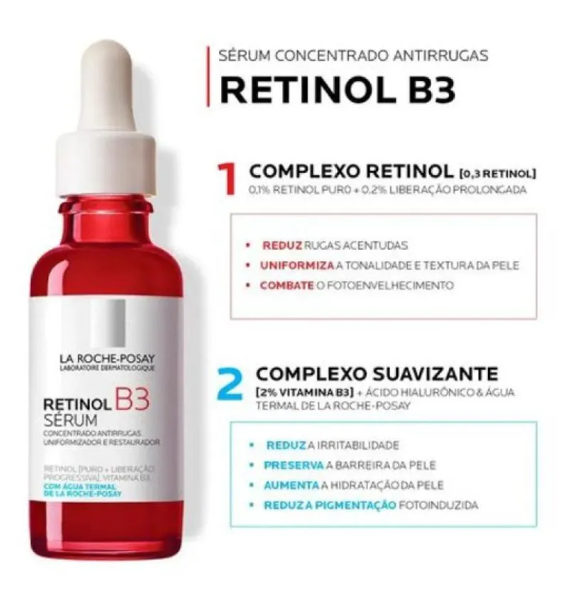 Sua textura é sérum não oleosa. Age na redução de rugas acentuadas, uniformiza a tonalidade e textura irregular da pele, melhora a firmeza e combate ao fotoenvelhecimento. O novo sérum Retinol B3 possui uma exclusiva combinação de ativos, complexo retinol + ácido hialurônico + vitamina B3 + água termal de La Roche-Posay capazes de garantir a eficácia dos resultados, associado à ação calmante e compensatória.
