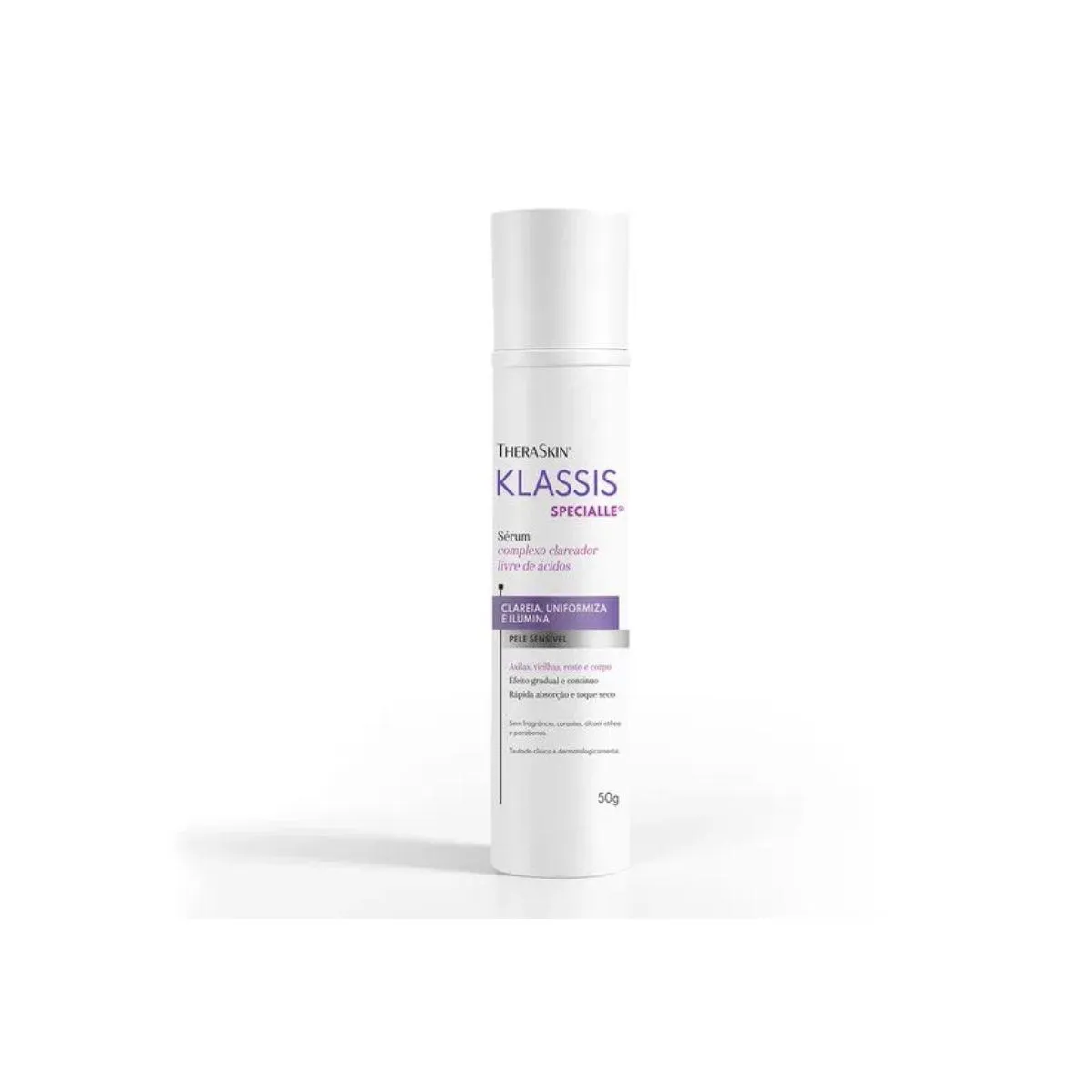 O Sérum Klassis® Specialle é um produto formulado para promover o clareamento gradual e contínuo da pele, especialmente para pessoas com problemas de hiperpigmentação.Sua composição iO Sérum Clareador Klassis® Specialle serve como clareador para peles sensíveis com hiperpigmentação, decorrente de excessiva exposição solar, uso de hormônios e medicações, alterações genéticas e fatores como stress. Por ser um sérum multifuncional, também ajuda a uniformizar e iluminar a pele. O Sérum Clareador Klassis® Specialle não contém ácido na fórmula e, por isso, pode ser usado em todo tipo de pele: oleosa, normal, seca e mesmo pele sensível. Também é recomendado para clarear a pele de áreas sensíveis como virilha, axila e rosto.Ingredientes ativos Sérum Clareador Klassis® Specialle¹: SymCalmin®: agente com efeito calmante e ação anti-infnovadora é livre de ácidos e, por isso, o sérum pode ser utilizado em áreas mais sensíveis, como virilha e axilas.Conta com um complexo pró-iluminador com 4 ativos despigmentantes em sua fórmula, além do SymCalmin, que tem propriedades anti-inflamatórias.