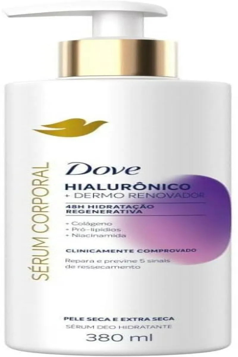 O novo Sérum Hidratante Corporal Dove Hialurônico com efeito dermo-renovador hidratante atua além da hidratação, para estimular a regeneração da pele e restaurar sua luminosidade natural. Este sérum corporal oferece 48h de hidratação regenerativa com ativos de alta potência, tais como: colágeno vegano, que ajuda a promover firmeza, sustentação e resistência à pele; Pró-lipídios, que ajudam na restauração da barreira protetora da pele, prevenindo a perda de hidratação; e Niacinamida, que ajuda a fortalecer a barreira cutânea e a estimular a renovação celular. Desenvolvido em parceria com dermatologistas e testado em mulheres reais, possui uma tecnologia exclusiva e avançada que hidrata profundamente e atua em sinergia com a sua pele, ajudando a restaurar sua maciez e luminosidade de dentro para fora.