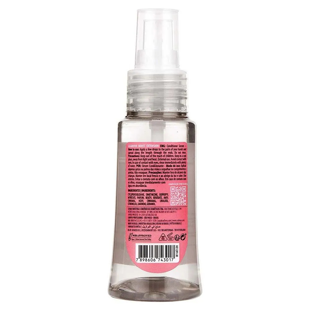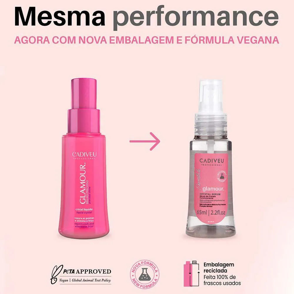 Novo Sérum de Cristais de Glamour com fórmula ultra concentrada sela pontas duplas e promove maciez e brilho intenso aos cabelos. Pode ser usado com ferramentas de calor, possui proteção térmica até 180ºC.