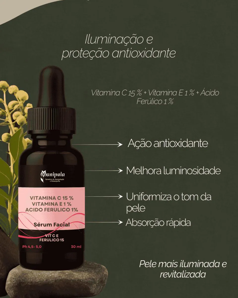 O Vit C E FERULICO 15 SkinLab Manipula é um sérum facial antioxidante desenvolvido para ajudar a proteger a pele contra os danos causados pelos radicais livres e melhorar a luminosidade da pele. Sua fórmula combina vitamina C, vitamina e e ácido ferúlico, ativos conhecidos por sua potente ação antioxidante e amplamente utilizados em dermocosméticos para contribuir com uma pele mais uniforme, iluminada e com aparência saudável. A vitamina c auxilia na proteção contra agressões externas e contribui para melhorar a aparência da pele opaca. Com textura leve e rápida absorção, o Vit C E FERULICO 15 pode ser incorporado facilmente à rotina diária de skincare. Propriedades: • ação antioxidante