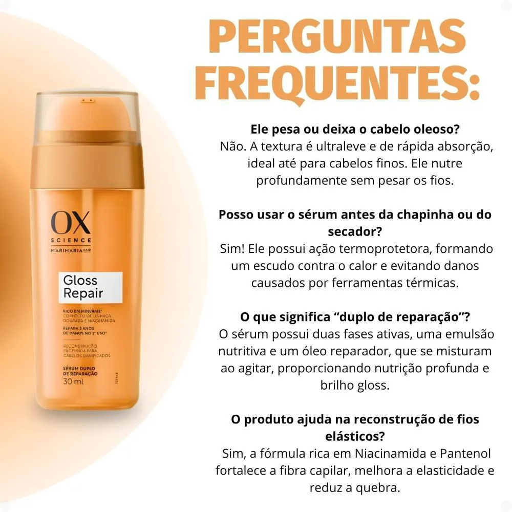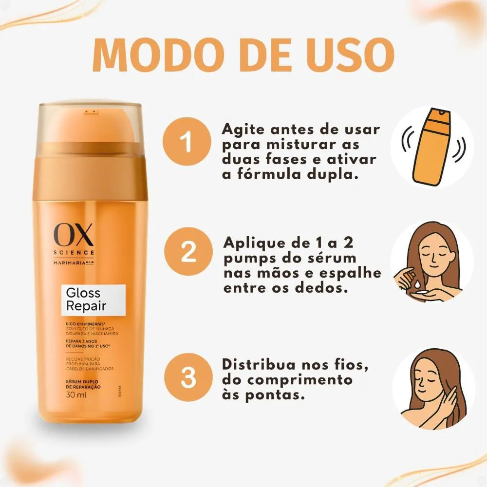 O Sérum Duplo de Reparação OX Science Mari Maria Hair Gloss Repair 30ml é o aliado perfeito para todas as ocasiões. Use-o diariamente para preparar seus cabelos antes de utilizar ferramentas térmicas, protegendo-os do calor e garantindo um visual impecável. Utilize-o como finalizador para um toque de brilho e maciez, realçando a beleza natural dos seus fios. Seja para um dia a dia corrido ou para um evento especial, este sérum é a escolha ideal para quem busca cabelos saudáveis, protegidos e radiantes em todos os momentos.Modo de Uso/Aplicação