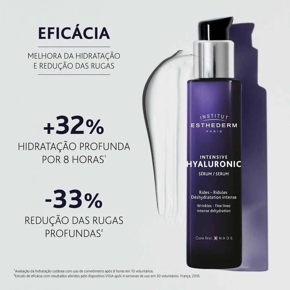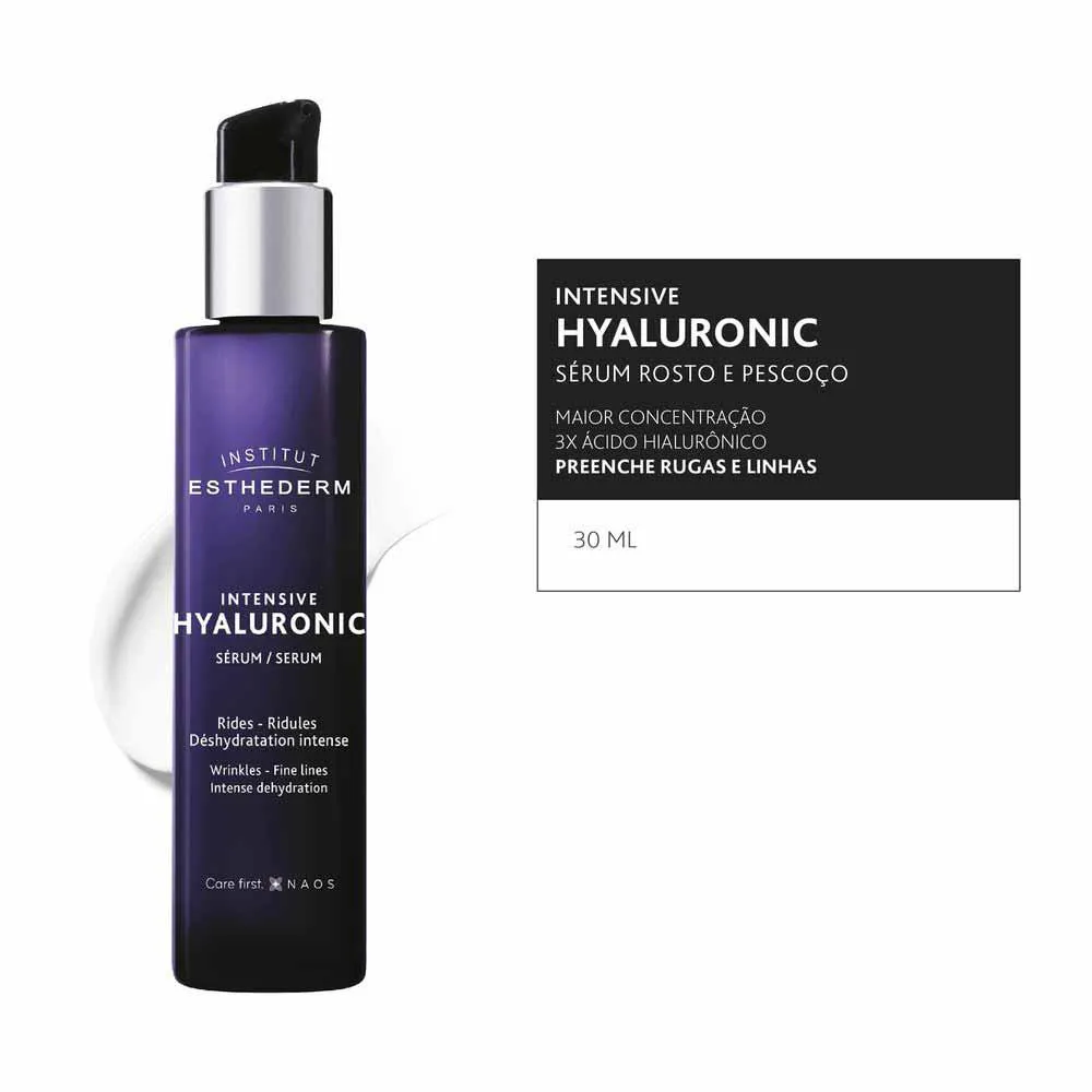 Intensive Hyaluronic Sérum reduz visivelmente as rugas e linhas finas, hidrata intensamente e devolve a luminosidade natural de uma pele jovem. Textura aqua-gel, com acabamento leve e não oleoso. Promove conforto imediato. Indicada para todos os tipos de pele, especialmente peles secas, desidratadas e com perda de viço. A pele fica com a superfície mais uniforme, mais hidratada e iluminada.