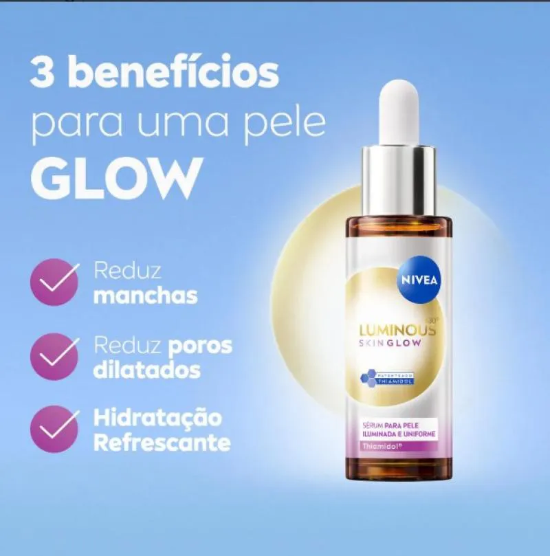 O Nivea Luminous630 Skin Glow é um sérum facial desenvolvido para quem busca uma pele com brilho natural, uniforme e saudável. Sua fórmula potente, enriquecida com Thiamidol, Niacinamida e Aloe Vera, atua em três dimensões: reduz manchas, diminui poros dilatados e hidrata profundamente. Além disso, promove uma sensação refrescante imediata e pode ser usado como primer antes da maquiagem.