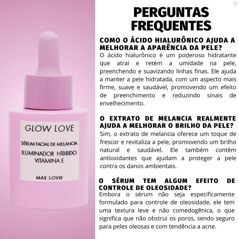 Sérum Facial Max Love Iluminador Híbrido Glow Love Melancia 30ml O Sérum Facial Max Love Iluminador Híbrido Glow Love Melancia 30ml é um produto multifuncional que proporciona hidratação, luminosidade e um acabamento radiante à pele. Sua fórmula leve e de rápida absorção combina ácido hialurônico e extrato de melancia, promovendo uma hidratação profunda enquanto oferece um toque de brilho natural. Ideal para todos os tipos de pele, ele deixa a pele com aparência fresca, iluminada e saudável, sem pesar. A fragrância suave de melancia torna a aplicação ainda mais agradável, e sua embalagem prática de 30ml é perfeita para uso diário. Perfeito para quem busca um efeito glow e uma pele revitalizada com um toque de frescor. . Contém: -Ácido Hialurônico -Extrato de Aloe Vera -Extrato de Melancia -Niacinamida -vitamina e . Modo de usar: Aplique sobre a palma das mãos 2 a 4 gotas do sérum e com a ponta dos dedos em movimentos circulares espalhe por todo rosto, até total absorção do produto. Precauções: Evite o contato com os olhos. Em caso de contato com os olhos enxágue bem com água. Não aplicar sobre a pele irritada ou lesada. Suspenda o uso se surgirem sinais de irritação. Mantenha fora do alcance das crianças. Conservar em local fresco e ao abrigo da luz e calor. . Perguntas Frequentes Posso usar o Sérum em áreas específicas do rosto? Sim, pode ser aplicado em áreas específicas como maçãs do rosto, ao redor dos olhos e nos lábios, mas sempre evitando o contato direto com os olhos. Posso usar o Sérum se tiver acne ou pele oleosa? Sim, o sérum tem uma textura leve e não comedogênica, ou seja, não obstrui os poros, sendo seguro para pele com acne ou oleosa. O Sérum ajuda a melhorar a textura da pele? Sim, com o uso contínuo, o sérum contribui para uma pele mais suave e uniforme, além de proporcionar um brilho saudável. O produto é adequado para uso durante o verão? Sim, a fórmula leve do sérum é ideal para o verão, pois hidrata e ilumina sem pesar na pele ou deixar sensação oleosa . Código de Registro Sanitário (ANVISA) 25351.443632/2024-91