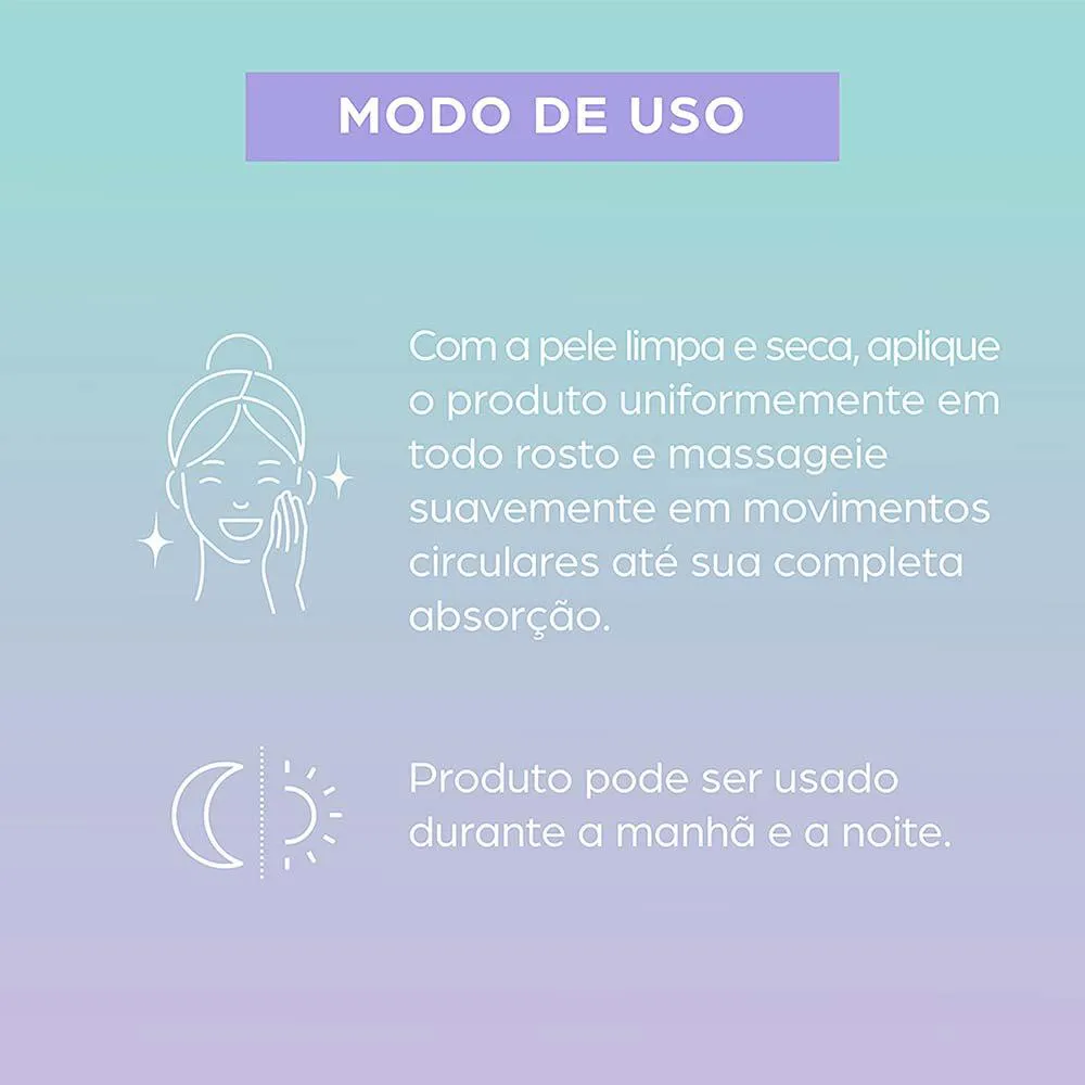 Com a pele limpa e seca aplique o produto uniformemente em todo rosto e massageie suavemente em movimentos circulares até sua completa absorção. Produto pode ser usado durante a manhã e a noite.