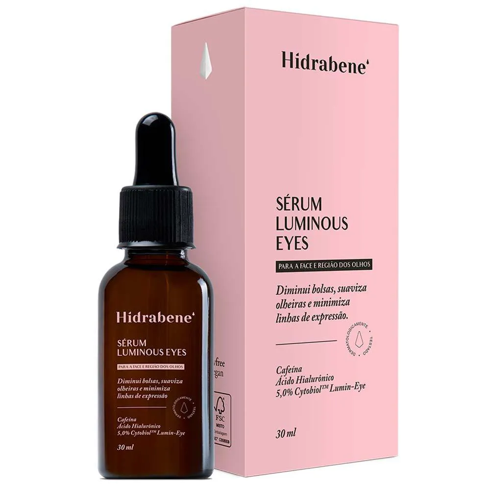 Feito exclusivamente para tratar e amenizar as olheiras. Com uma combinação de ativos que clareiam as regiões hipercrômicas e diminuem as bolsas, o Hidrabene Sérum Luminous Eyes, protege e restaura a circulação no local. Além de hidratar a pele do rosto, tem ação firmadora e atenua linhas de expressão. Produto oil free, oftalmologicamente testado, hipoalergênico, formulado de maneira a minimizar possível surgimento de alergia.
