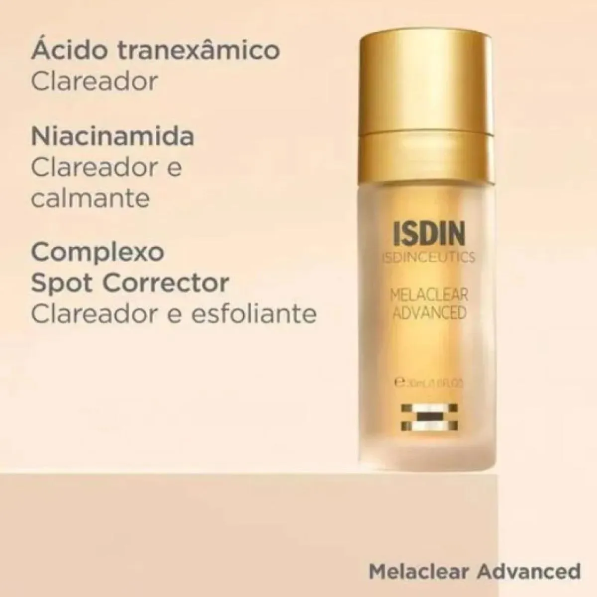 O que é o Melaclear Advanced?Melaclear Advanced é um sérum facial clareador da linha Isdinceutics, formulado com Ácido Tranexâmico e Complexo Spot Corrector, que atua em todas as fases de aparição das marcas escuras.