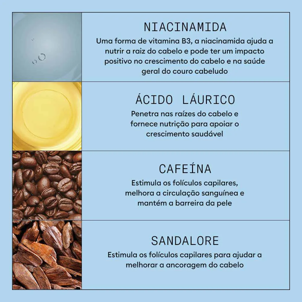 - Estimula o crescimento saudável com ativos potentes como sandalore, cafeína, ácido láurico e niacinamida;