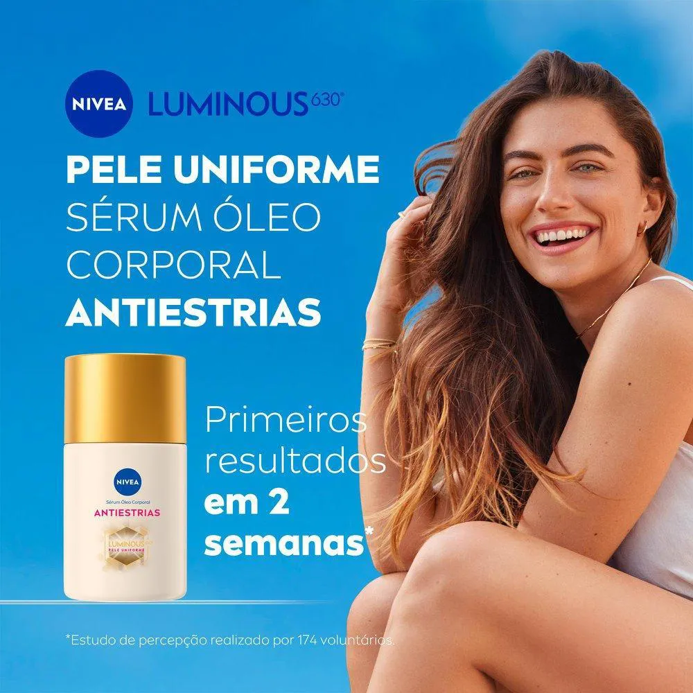 Para que serve? NIVEA LUMINOUS 630® Sérum Óleo Corporal Antiestrias 100 ml é um óleo que age por 48 horas na pele enquanto combate marcas escurecidas, estrias e marcas de sol, deixando o tom uniforme em 2 semanas de uso*, agindo desde o primeiro dia de aplicação. Seu uso contínuo previne o surgimento de novas marcas. *Estudo de percepção realizado por 174 voluntárias.