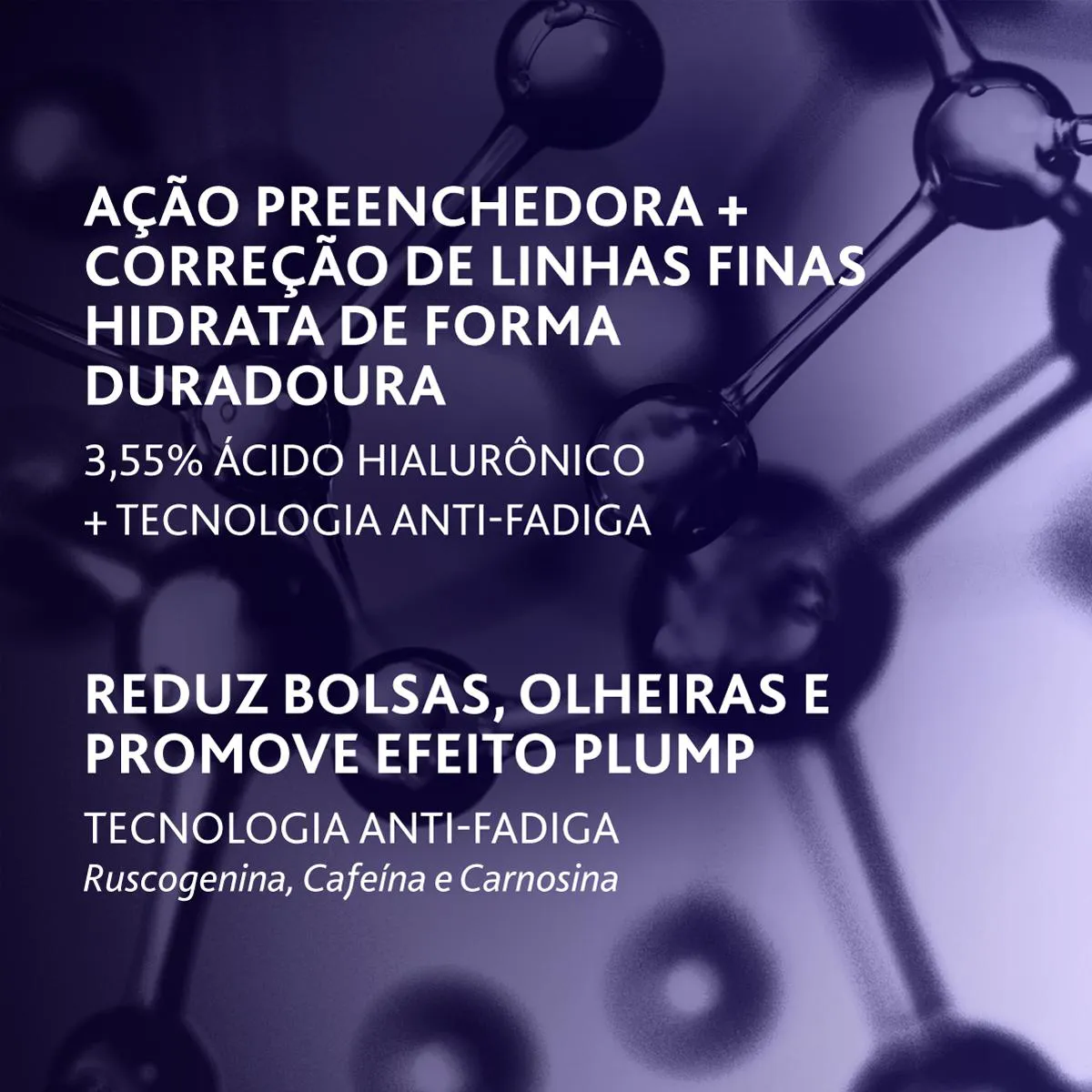 Sua fórmula é composta por uma associação patenteada de 3 formas diferentes de ácido hialurônico em altas concentrações associados à tecnologia anti-fadiga, que conta com a sinergia de 3 ativos (Cafeina, Ruscogenina e Carnosina) para redução de bolsas e olheiras.