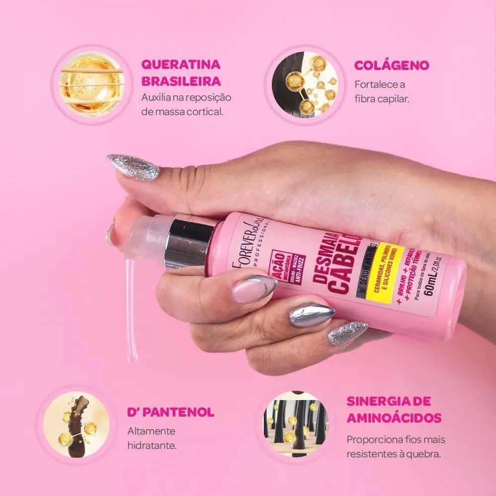Proteção térmica, redução de frizz e brilho intenso para um acabamento impecável O Sérum Reparador de Pontas Desmaia cabelo Forever Liss é o finalizador perfeito para fios alinhados, protegidos e livres de frizz. Sua fórmula leve e concentrada sela as cutículas, combate as pontas duplas e oferece proteção térmica contra danos causados por secador, chapinha e babyliss.