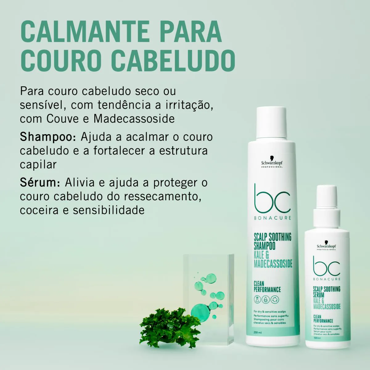 Formulado com ingredientes naturais e orgânicos, o Sérum Schwarzkopf Professional Bonacure Soothing inclui ativos calmantes que reduzem a irritação e melhoram a saúde do couro cabeludo.