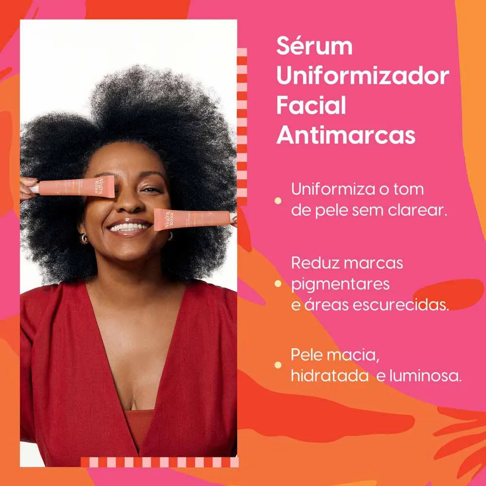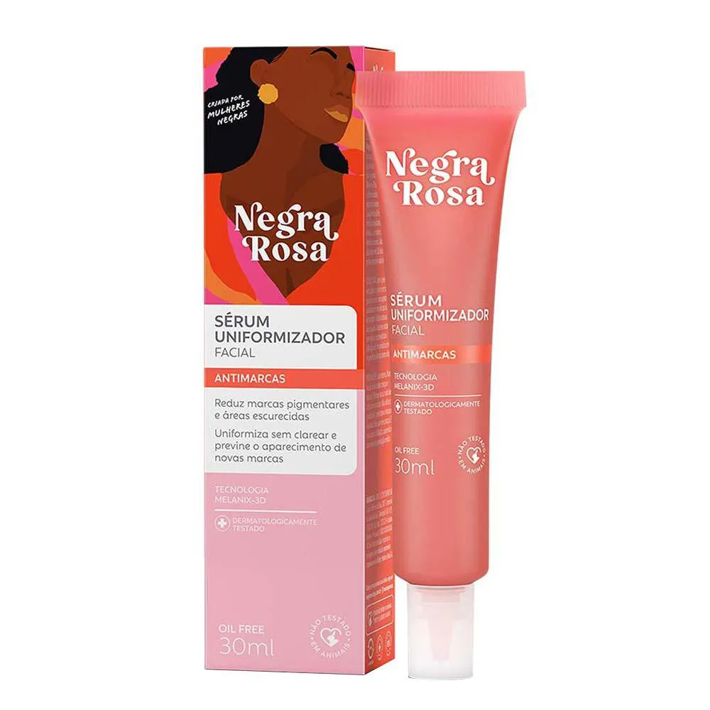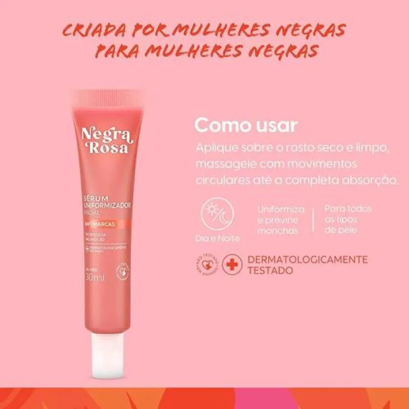 O Sérum Uniformizador Facial Negra Rosa auxilia na redução de marcas pigmentares e áreas escurecidas, uniformizando o tom da pele sem efeito clareador.