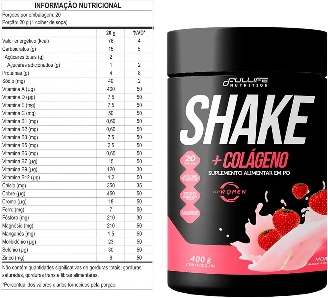- O SHAKE SUBSTITUTO DE REFEIÇÃO FULLIFE é SEM GLUTEN e com COLAGENO com uma fórmula completa e exclusiva, shake for women foi desenvolvido com qualidade nutricional, sua fórmula contém colágeno hidrolisado que atua como uma auxiliar para fortalecimento da pele para quem esta em processo de emagrecimento, contém em sua composição vitaminas e minerais que essenciais.