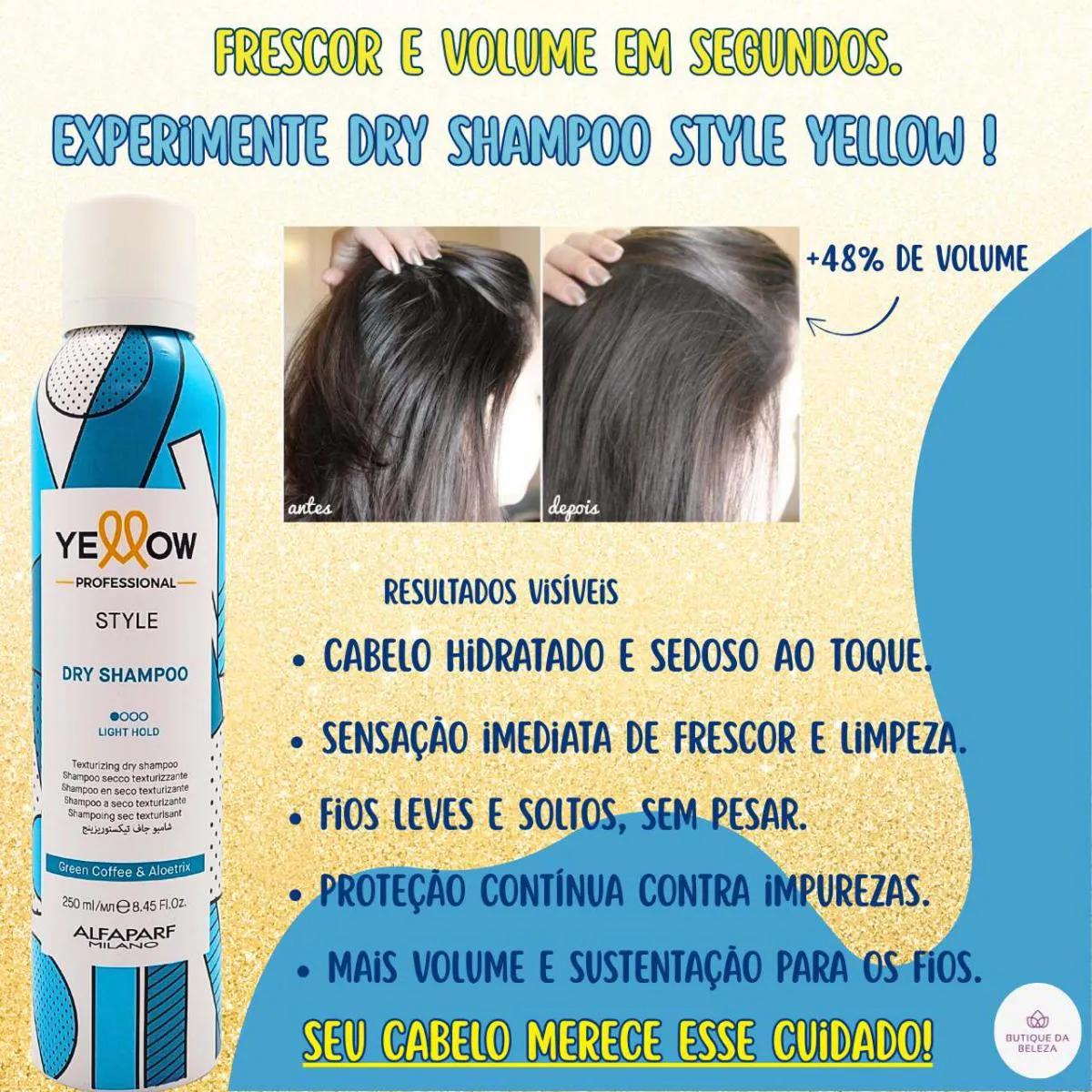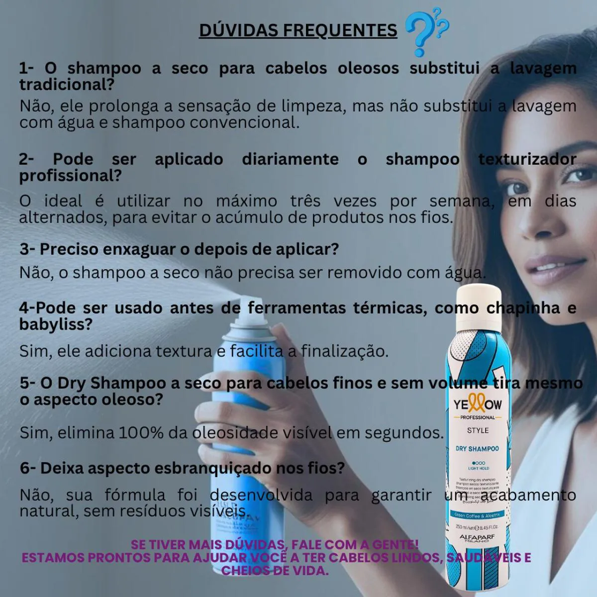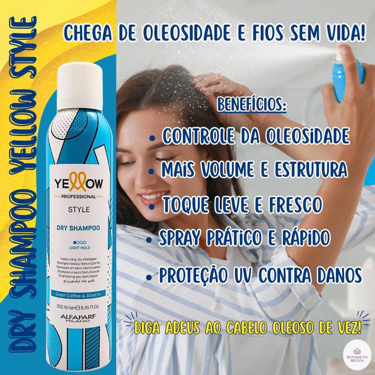 Somos a BUTIQUE DA beleza Uma empresa especializada no comércio de Cosméticos e Semijoias. Estamos sempre entre os Melhores Vendedores. NOSSO COMPROMISSO É COM VOCÊ! SEU CONFORTO E SEGURANÇA SÃO NOSSOS PROPÓSITOS YELLOW STYLE DRY shampoo TEXTURIZANTE PROFISSIONAL Cansada de acordar com os cabelos oleosos e sem vida? Chega de fios oleosos, sem movimento e aparência opaca! Cabelos limpos, volumosos e cheios de vida em Segundos! O Dry Shampoo Texturizante Yellow Style Profissional não apenas refresca, mas também transforma os cabelos, proporcionando textura, volume e movimento natural. Sua fórmula inovadora, absorve instantaneamente a oleosidade e odores, deixando os fios leves, soltos e com aparência impecável, como se tivessem acabado de serem lavados. Desenvolvido para dar corpo e sustentação aos fios sem deixar resíduos, ele traz o poder do café verde, rico em ômega 6 e vitamina e, que protege contra a desidratação, garantindo nutrição e vitalidade. Já o exclusivo complexo Aloetrix, com aloe vera, proteínas do trigo e filtros UV, oferece maciez e defesa intensa para a fibra capilar. Praticidade, proteção e beleza em um só produto! INDICADO PARA QUAIS TIPO DE cabelo Cabelos Finos e sem Volume Cabelos Lisos Cabelos Oleosos Cabelos Cacheados, Ondulados e Crespos Cabelos Quimicamente Tratados Cabelos com Extensões Todos os Tipos de Cabelo BENEFÍCIOS Absorve a Oleosidade: prolonga a sensação de frescor e limpeza sem necessidade de lavar os fios. Textura Leve: não deixa resíduos visíveis e mantém o movimento dos fios. Proporciona Sustentação: ajuda a dar volume e estrutura ao penteado. Proteção Contra Danos Externos: com filtros UV que preservam os fios da exposição ao sol e danos ambientais. Aplicação Rápida e Prática: formato em spray para uma distribuição uniforme. RESULTADOS Fios Leves e Soltos Fios Hidratados e Sedosos Sensação de Frescor e Limpeza Volume e Sustentação Proteção Contínua MODO DE USO 1- Agite bem a embalagem antes de aplicar. 2- Pulverize o produto nos cabelos secos, mantendo uma distância de aproximadamente 25 cm. 3- Concentre-se na raiz, onde há maior acúmulo de oleosidade. 4- Espere alguns segundos para que o produto absorva a oleosidade. 5- Massageie suavemente com as pontas dos dedos para distribuir melhor. 6- Penteie ou modele os fios conforme desejar. DICA DA BUTIQUE DA BELEZA Para um resultado impecável, aplique o Dry Shampoo Yellow Style antes de dormir e acorde com fios leves e radiantes. DÚVIDAS FREQUENTES O shampoo a seco para cabelos oleosos substitui a lavagem tradicional? Não, ele prolonga a sensação de limpeza, mas não substitui a lavagem com água e shampoo convencional. Pode ser aplicado diariamente o shampoo texturizante profissional? O ideal é utilizar no máximo três vezes por semana, em dias alternados, para evitar o acúmulo de produtos nos fios. Preciso enxaguar depois de aplicar? Não, o shampoo para cabelos finos e oleosos não precisa de enxargue. Pode ser aplicado antes de ferramentas térmicas, como chapinha e secador? Sim, ele adiciona textura e facilita a finalização. Deixa aspecto esbranquiçado nos fios? Não, sua fórmula foi desenvolvida para garantir um acabamento natural, sem resíduos visíveis. O Dry Shampoo a seco para cabelos finos e sem volume tira mesmo o aspecto oleoso? Sim, elimina 100% da oleosidade visível em segundos.