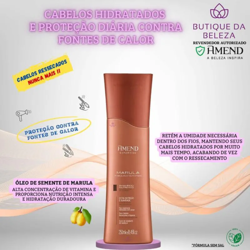 Somos a BUTIQUE DA beleza Uma empresa especializada no comércio de Cosméticos e Semijoias. Estamos sempre entre os Melhores Vendedores. NOSSO COMPROMISSO É COM VOCÊ! SEU CONFORTO E SEGURANÇA SÃO NOSSOS PROPÓSITOS SERVIR E AJUDAR SÃO NOSSOS DEVERES shampoo AMEND EXPERTISE MARULA FABULOUS NUTRITION 250ML Cabelos com aparência ressecada e áspera?! Nunca mais! A Butique da Beleza apresenta o Shampoo Marula Fabulous Nutrition, de Amend. Esse shampoo, de origem vegana, sem sal, garante nutrição e hidratação intensa ao cabelo sem pesar nos fios. Seu complexo de ativos (óleo da semente de marula e vitamina e) fornece uma gama de substâncias necessárias para que o cabelo tenha a nutrição necessária para perder a aspereza e o ressecamento, trazendo de volta a elasticidade e oleosidade natural dos fios. Tenha em mãos um poderoso aliado para a manutenção capilar diária que irá garantir seus fios nutridos, protegidos e longe do ressecamento. ATIVOS - ÓLEO DE SEMENTE DE MARULA Com alta concentração de vitamina E, sua fórmula proporciona nutrição intensa, além de reter a hidratação dentro dos fios, evitando o ressecamento. INDICADOS - Cabelos Ressecados. - Cabelos Ásperos. - Cabelos Secos. - Cabelos Opacos. - Todos os Tipos de Cabelos. BENEFÍCIOS - Nutrição Intensa. - Hidratação Duradoura. - Termoproteção. - Brilho. - Maciez. MODO DE USO Com o cabelo úmido, aplique o Shampoo para Nutrição Amend Marula Fabulous Nutrition por todo comprimento, pontas e depois leve a espuma até a raiz. Massageie e prossiga com o enxágue. Dica da Butique da Beleza Para um resultado otimizado, recomendamos o uso de toda linha Amend Expertise Marula Fabulous Nutrition.