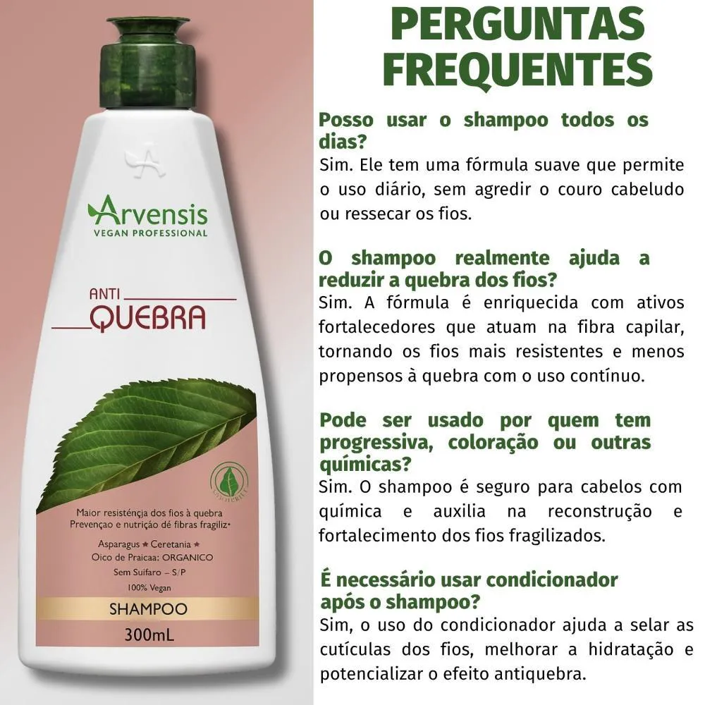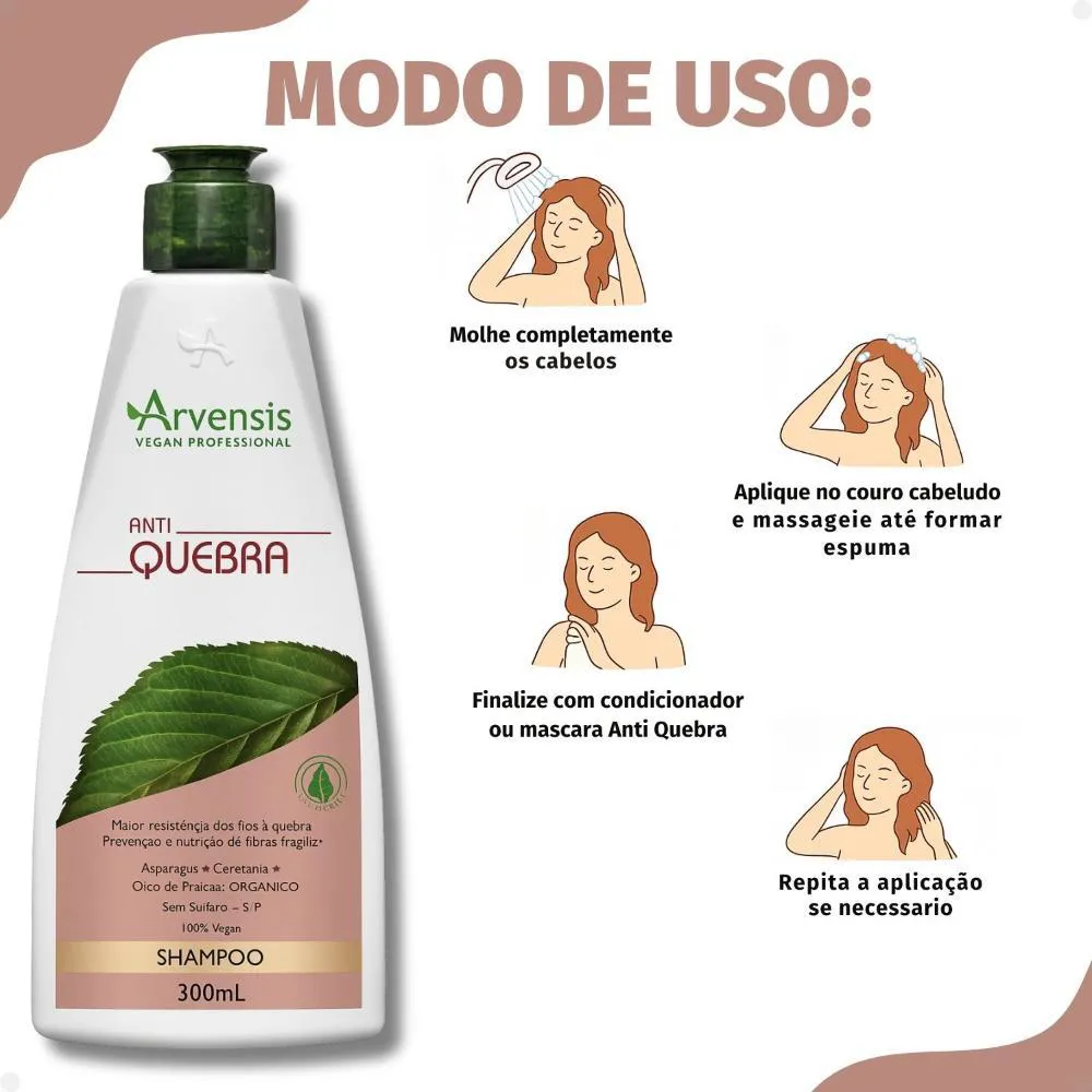 shampoo Arvensis Anti Quebra 300ml O Shampoo Arvensis Anti Quebra foi desenvolvido especialmente para cabelos enfraquecidos, quebradiços e com dificuldade de crescimento saudável. Sua fórmula exclusiva é rica em ativos fortalecedores, como extratos vegetais e proteínas, que limpam suavemente enquanto agem diretamente na fibra capilar, reforçando a estrutura dos fios e ajudando a reduzir a quebra. Com uso contínuo, o cabelo ganha mais resistência, brilho e vitalidade, além de crescer mais forte e saudável da raiz às pontas. .