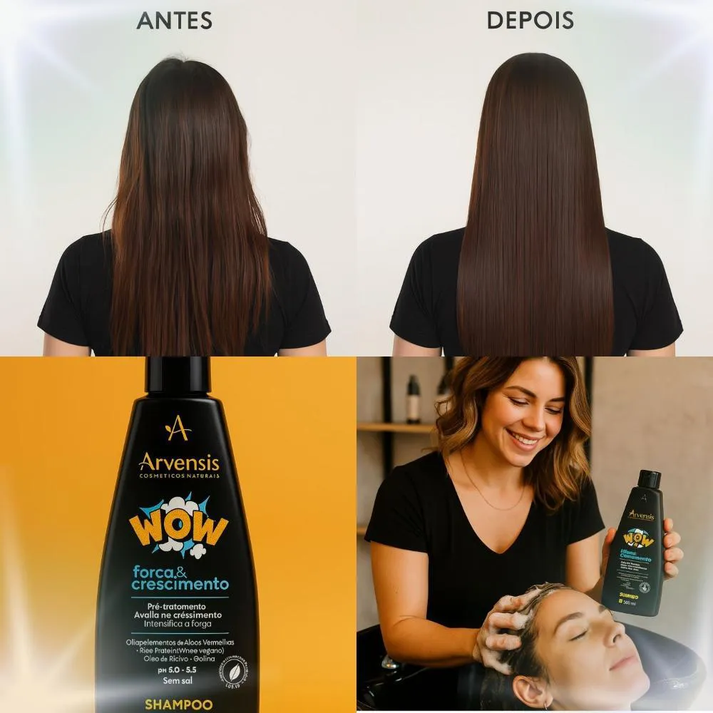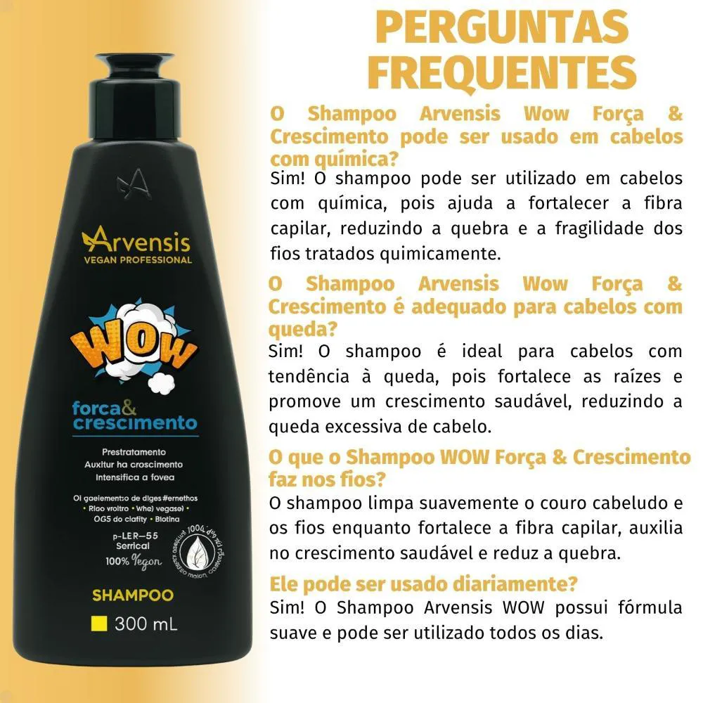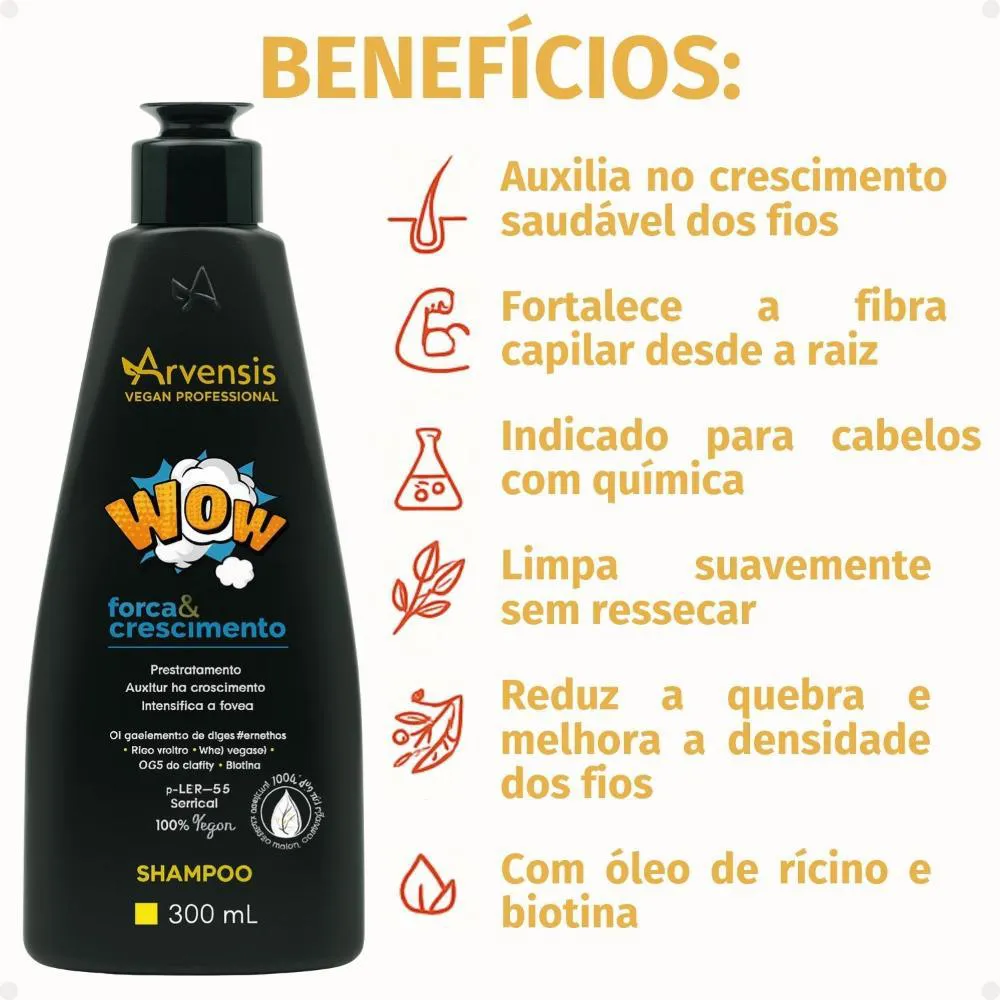 shampoo Arvensis Wow Força & Crescimento 300ml A linha WOW Força e Crescimento é um suplemento capilar de alta eficácia, capaz de promover um tratamento intensivo nos cabelos afinados e com crescimento comprometido. Sua fórmula, enriquecida com oligoelementos de algas vermelhas, rice protein (whey vegano), óleo de rícino e biotina, age na camada mais profunda dos fios, aumentando a força, a vitalidade e a resistência da estrutura capilar, contribuindo para o crescimento saudável. . -Dermatologicamente Testado -Oligoelementos de Algas Vermelhas -Rice Protein (Whey Vegano) -Óleo de Rícino -pH 5,0-5,5 -Biotina -100% vegano -Sem sal . Modo de usar: Aplicar o Shampoo WOW Força e Crescimento nos cabelos molhados, massagear o couro cabeludo e comprimento dos fios suavemente até formar espuma. Enxaguar bem. Reaplicar, se necessário. O uso completo da linha WOW Força e Crescimento favorece os resultados. Precauções: Somente para uso externo. Manter fora do alcance de crianças. Caso ocorrer alguma irritação, suspender o uso. Manter em local fresco e longe da iluminação solar. . Perguntas Frequentes Posso usar o Shampoo Arvensis Wow Força & Crescimento em cabelos oleosos? Sim! O shampoo é adequado para todos os tipos de cabelo, incluindo os oleosos, pois limpa suavemente o couro cabeludo sem ressecar os fios, ajudando a equilibrar a oleosidade. O Shampoo Arvensis Wow Força & Crescimento pode ser usado em cabelos com química? Sim! O shampoo pode ser utilizado em cabelos com química, pois ajuda a fortalecer a fibra capilar, reduzindo a quebra e a fragilidade dos fios tratados quimicamente. O Shampoo Arvensis Wow Força & Crescimento é adequado para cabelos com queda? Sim! O shampoo é ideal para cabelos com tendência à queda, pois fortalece as raízes e promove um crescimento saudável, reduzindo a queda excessiva de cabelo. O que o Shampoo WOW Força & Crescimento faz nos fios? O shampoo limpa suavemente o couro cabeludo e os fios enquanto fortalece a fibra capilar, auxilia no crescimento saudável e reduz a quebra. Ele pode ser usado diariamente? Sim! O Shampoo Arvensis WOW possui fórmula suave e pode ser utilizado todos os dias. . Código de Registro Sanitário (ANVISA) 25351.499649/2016-09