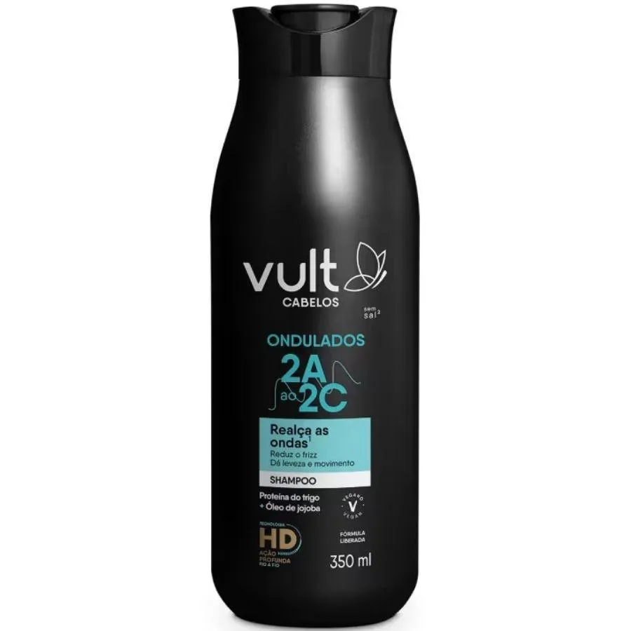 Vult Cabelos Ondulados 2A ao 2C shampoo para cabelos ondulados. Vult Cabelos Ondulados 2A ao 2C limpa enquanto realça as ondas, reduz o frizz e dá leveza e movimento. O Shampoo Vult Cabelos Ondulados 2A ao 2C ajuda a deixar as ondas¹ com menos frizz e mais movimento. Desenvolvido para as curvaturas 2A ao 2C, este shampoo para ondulados é ideal para higienizar e cuidar das ondas. Com Proteína do Trigo e Óleo de Jojoba, possui fórmula hidratante e espuma cremosa que não resseca ou embaraça os fios, deixando-os limpos e com movimento. Possui pH 4,8 - 5,3, reduz pontas duplas, elimina o frizz por até 72h e conta com deliciosa fragrância desenvolvida exclusivamente para ter maior durabilidade em cabelos ondulados e cacheados ,prolongando a perfumação.