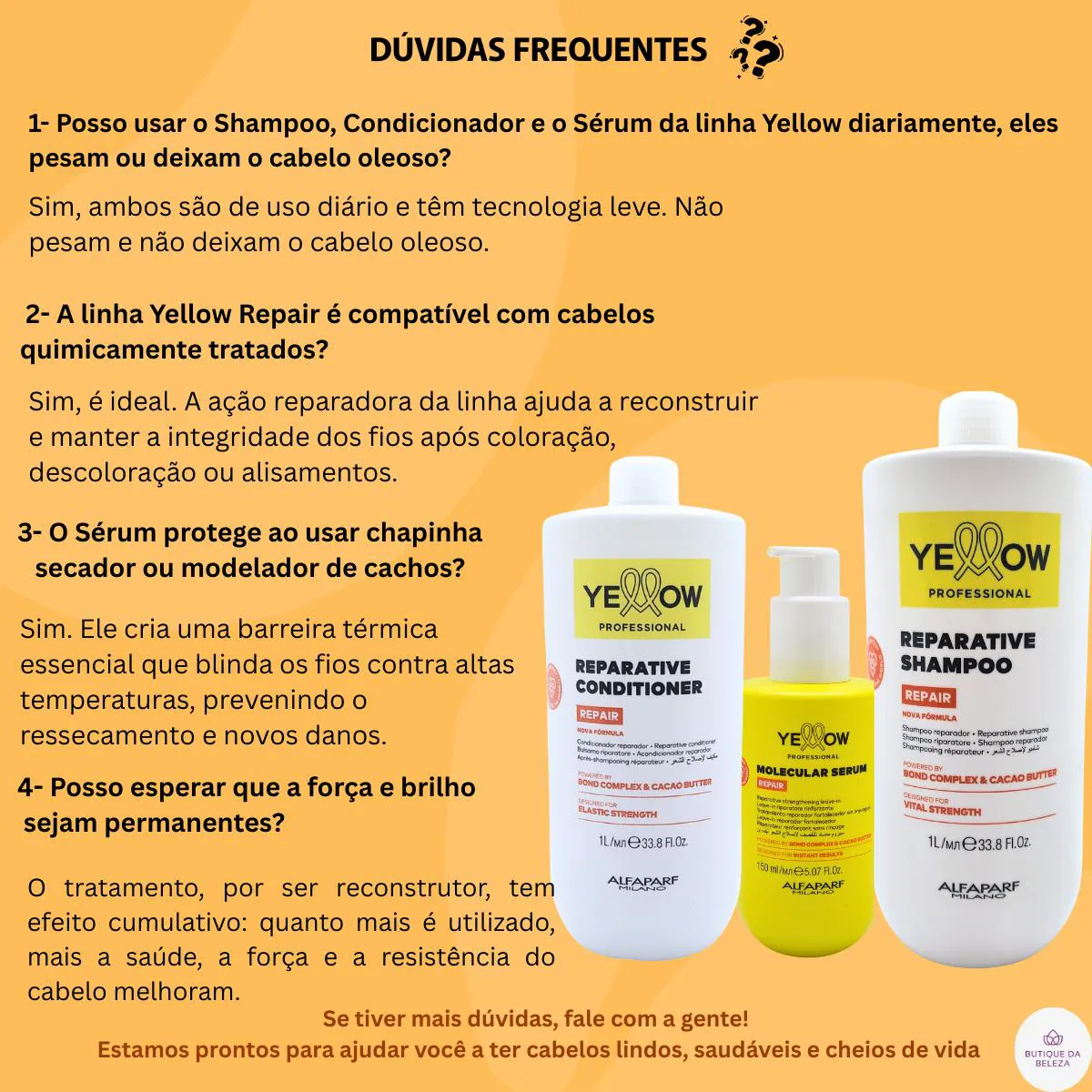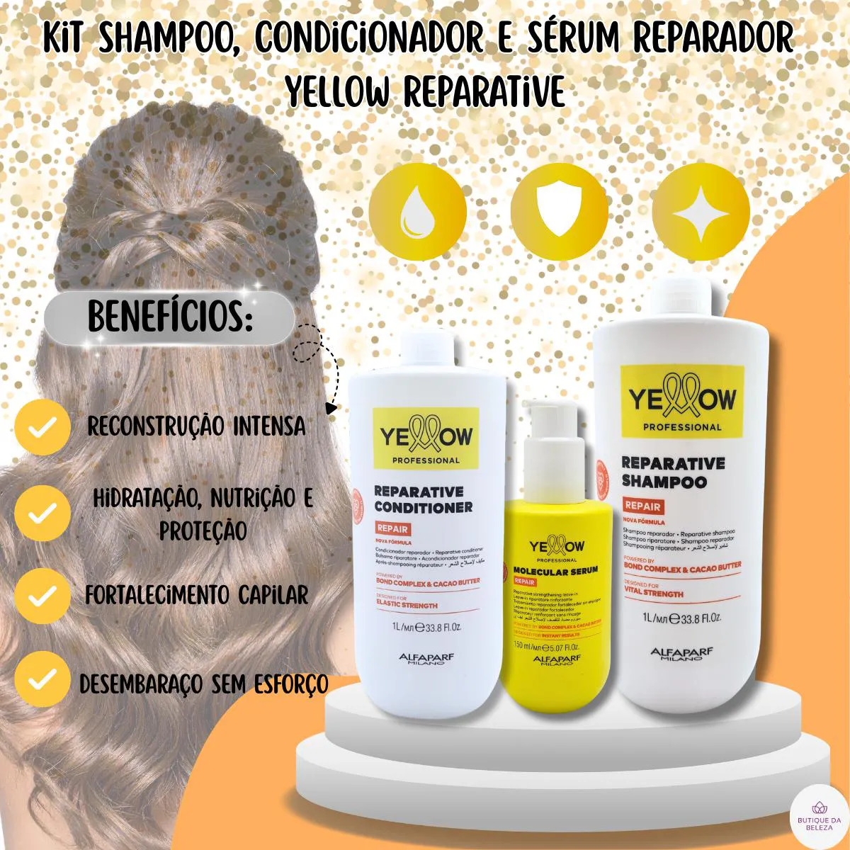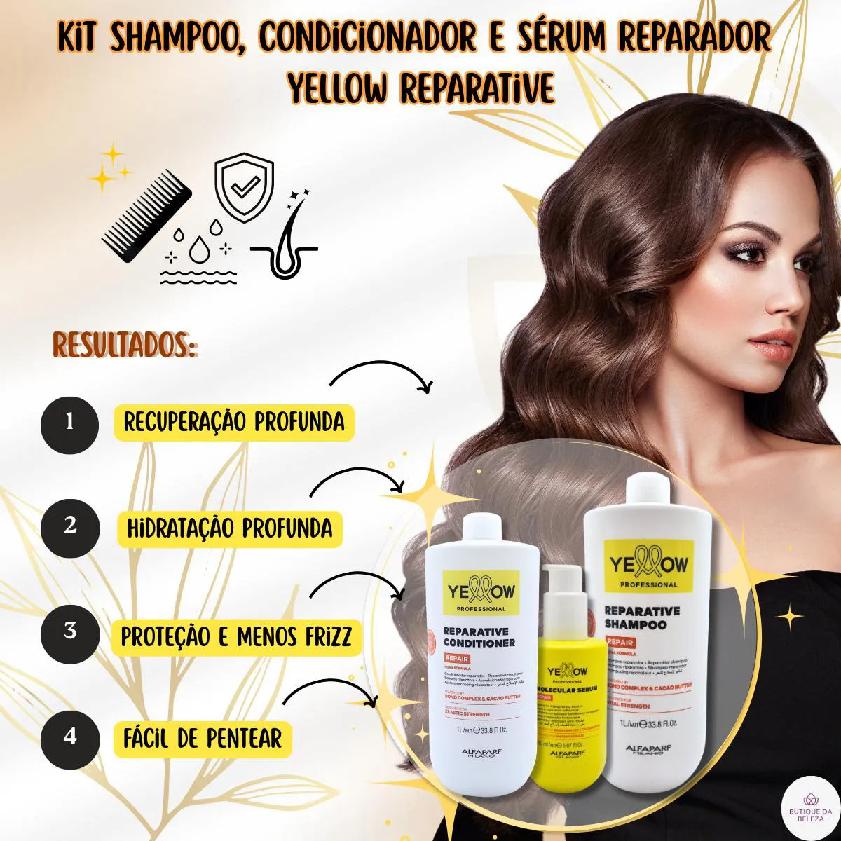 ESTE KIT CONTÉM 1 shampoo YELLOW REPARATIVE 1000ml 1 condicionador YELLOW REPARATIVE 1000ml 1 SÉRUM MOLECULAR YELLOW REPARATIVE 150ml Somos a BUTIQUE DA beleza