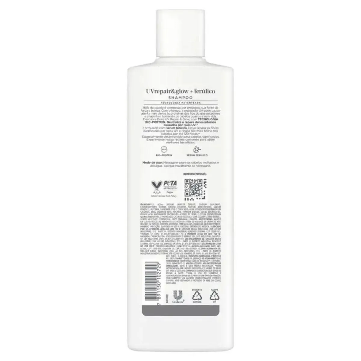 O Shampoo Dove UV Repair & Glow + Ferúlico foi desenvolvido para reverter os danos causados pelos raios UV e proteger os cabelos contra os efeitos nocivos do sol por até 70 horas. Sua fórmula combina ação antioxidante e a tecnologia UV Ferúlico, que transforma cabelos opacos, foscos e sem vida, deixando-os com até 10 vezes mais brilho. Ideal para quem busca proteção prolongada, brilho intenso e fortalecimento dos fios.
