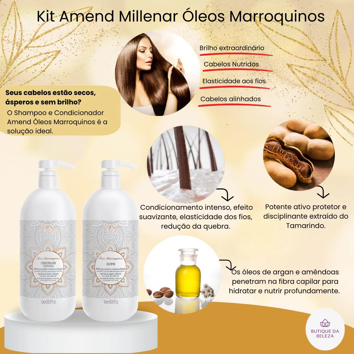 - Nutre profundamente os fios com óleos marroquinos ricos em ácidos graxos e vitaminas.