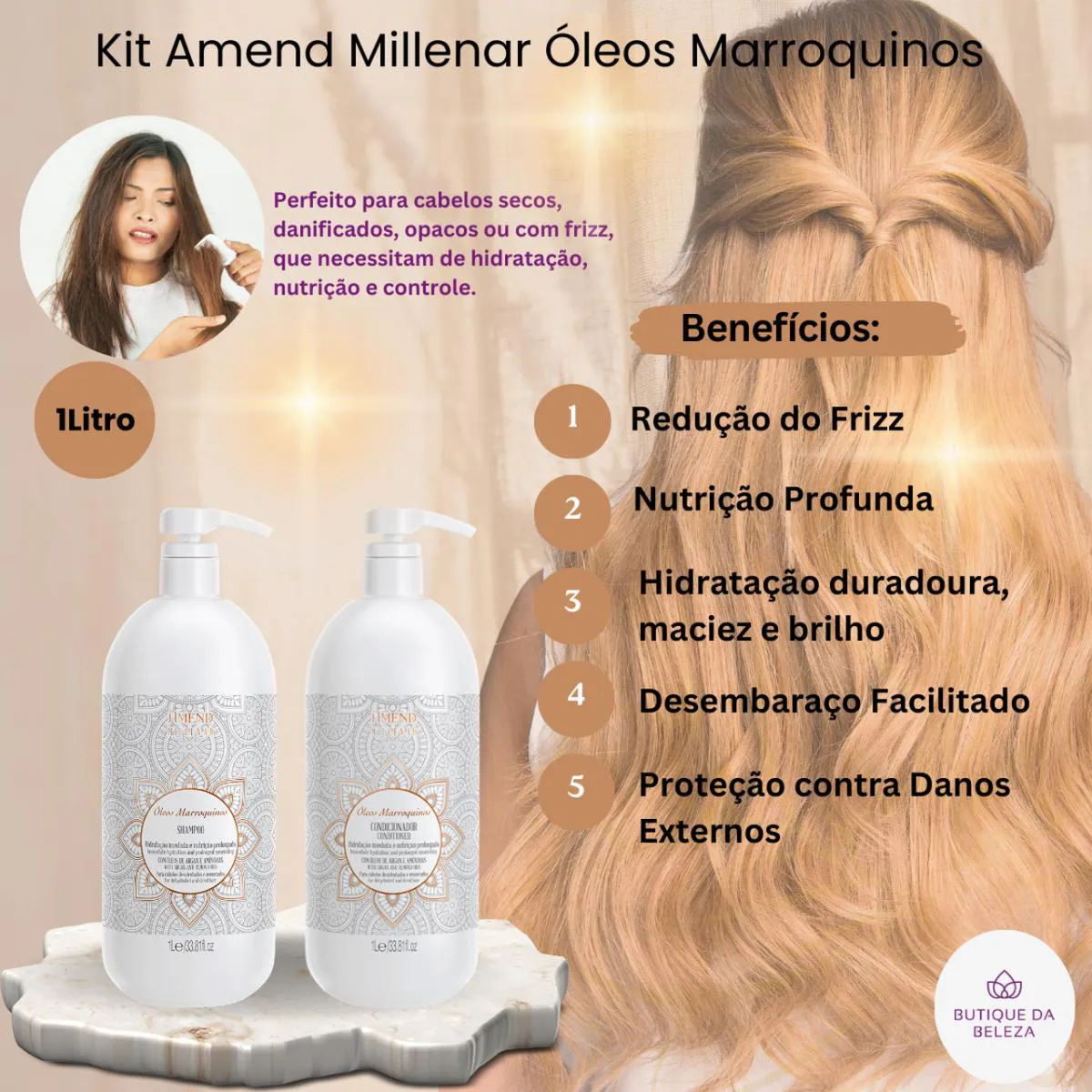 O kit é composto por um shampoo e um condicionador profissionais desenvolvidos para hidratação e nutrição capilar, formulados com óleos de argan e amêndoas. São produtos destinados a restaurar a saúde, o brilho e a maciez dos cabelos, especialmente indicados para fios secos, danificados, opacos ou com frizz.