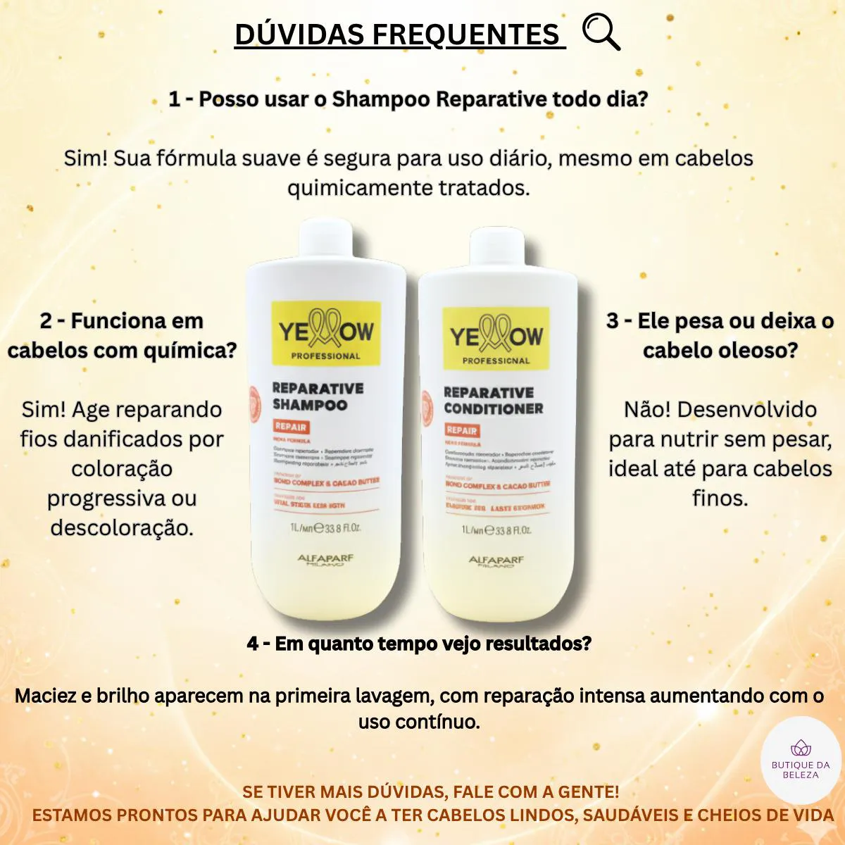 Sim, ambos são de uso diário e têm tecnologia leve. Não pesam e não deixam o cabelo oleoso. A linha Yellow Repair é compatível com cabelos quimicamente tratados?